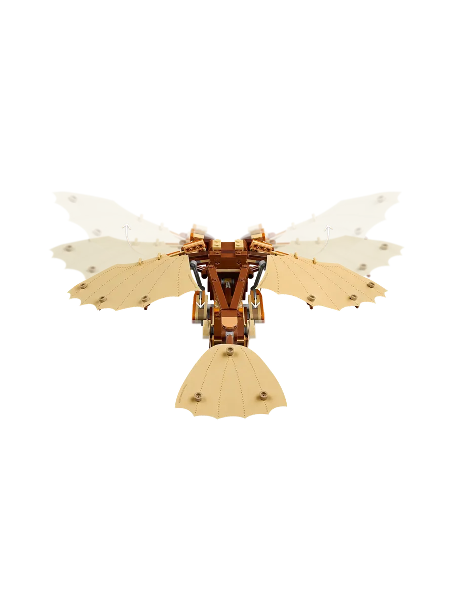 Собирая модель, вы откроете для себя сложную, но захватывающую конструкцию: легкий каркас, парящие крылья с текстильным покрытием и открытый механизм из тросов, шарниров и шкивов, который приводит всё в движение. Каждое движение крыльев оживляет аппарат, показывая, насколько гениален был замысел его создателя.
