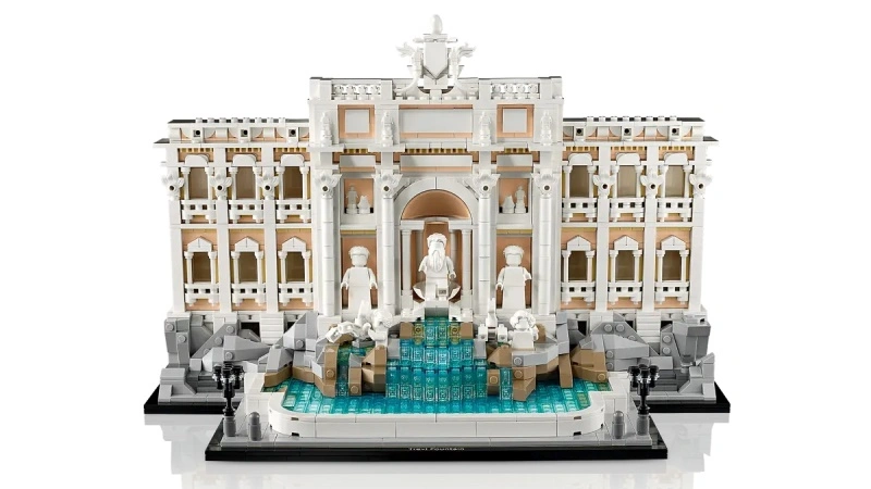 Перед вами точное воспроизведение барочного шедевра: колоннады, скульптурные композиции, львы и каскад воды, выполненные в характерных светлых тонах. Конструктор передает атмосферу итальянской столицы, приглашая воссоздать историю легендарного фонтана, у которого туристы загадывают желания, бросая монетки.