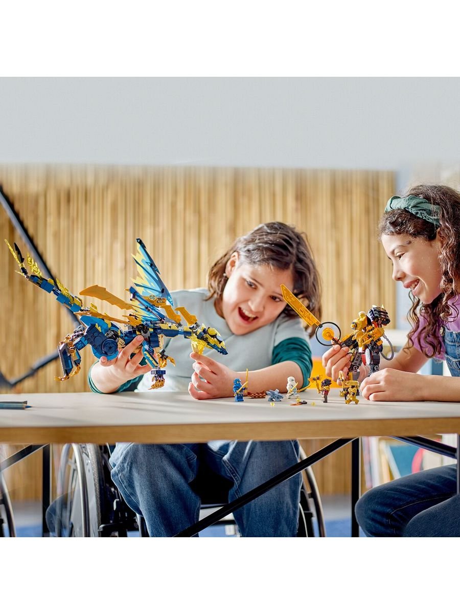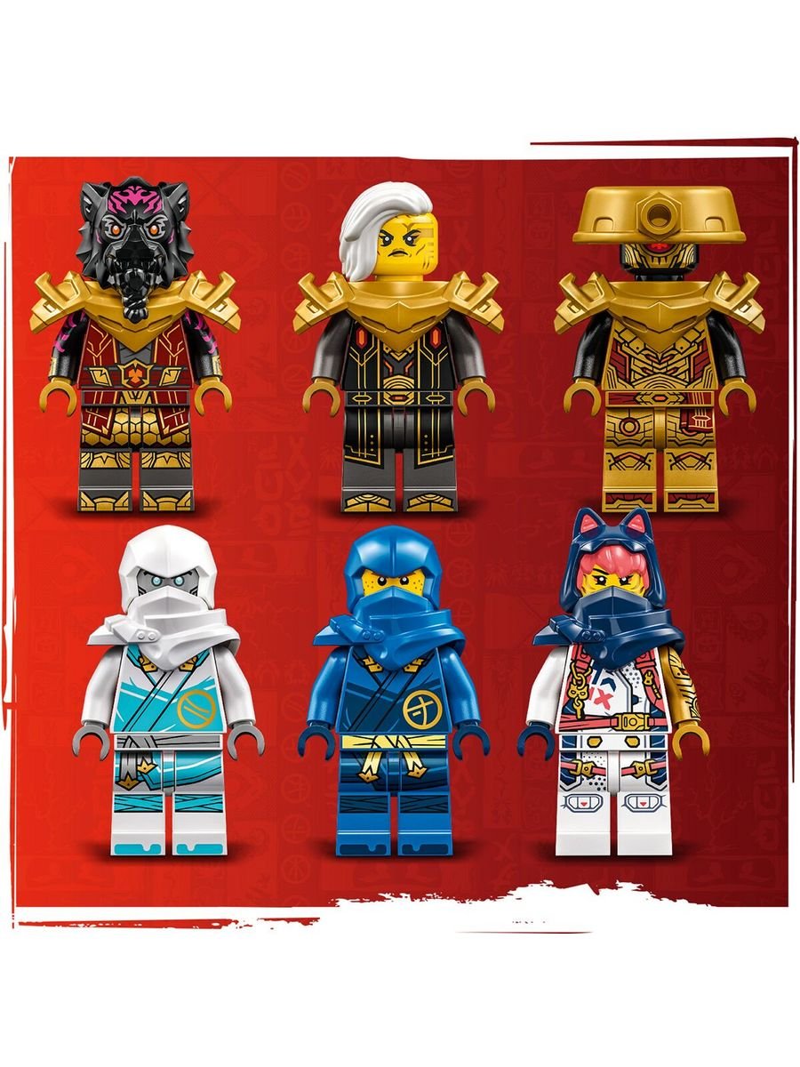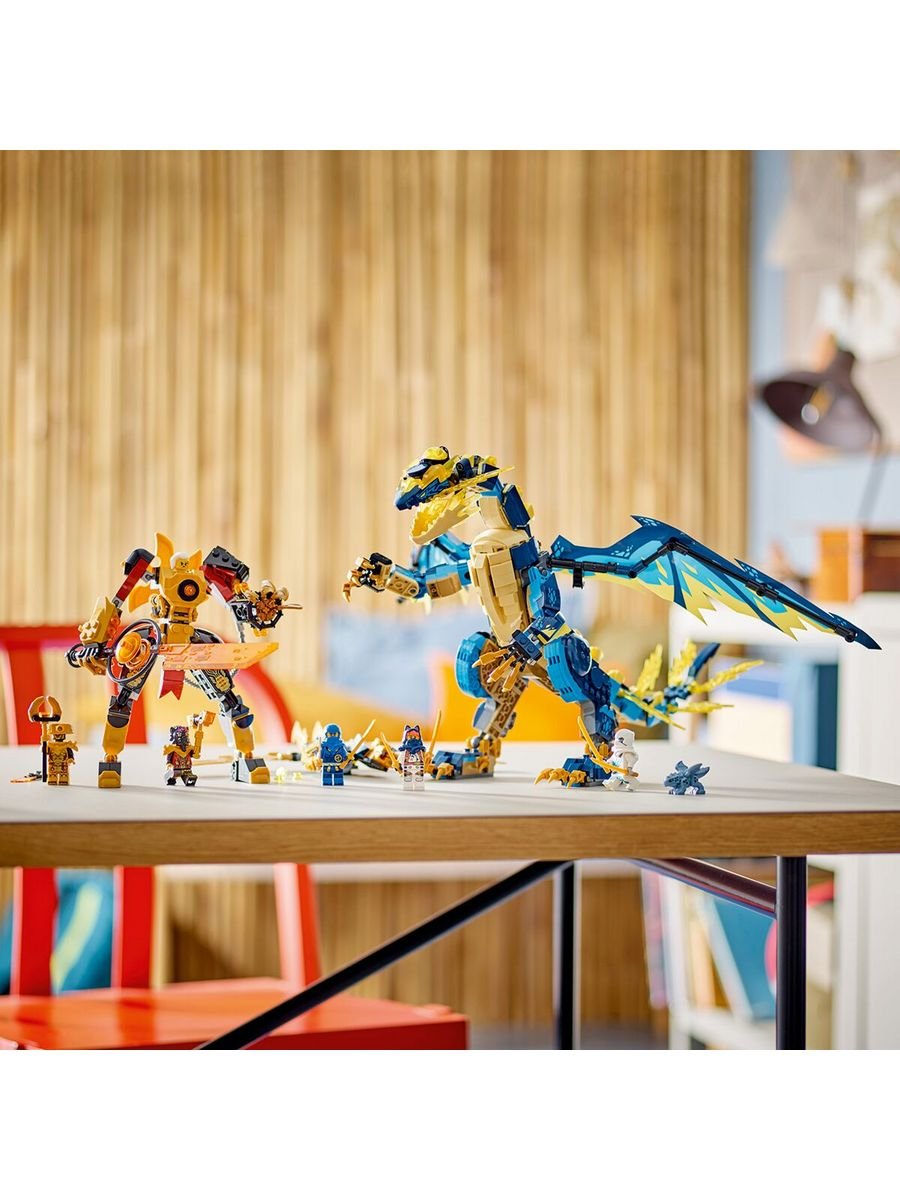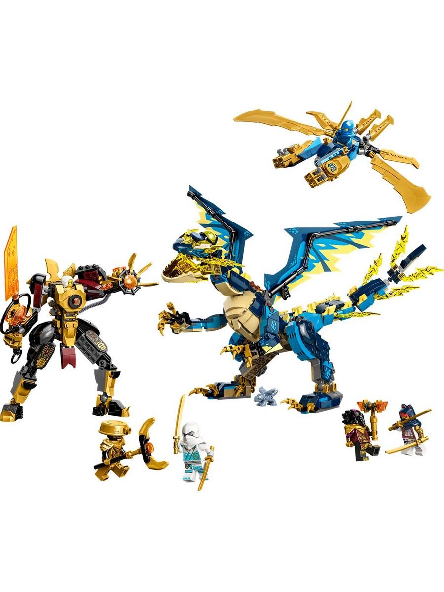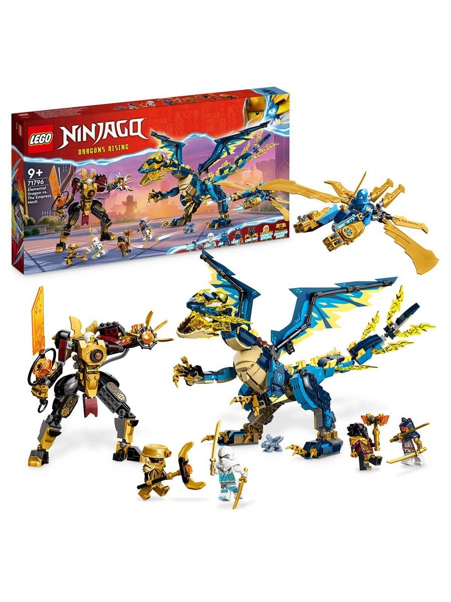 Игрушка премиум-класса для детей. Игровой набор «Дракон и мех» – Дети старше 9 лет могут разыграть эпическую схватку из телесериала NINJAGO Dragons Rising с элементальным драконом против. Набор «Робот Императрицы» (71796). 6 минифигурок – Джей, Сора и Зейн, у каждого из которых по 2 золотые катаны, чтобы сразиться с лордом Расом и его молотом, императрица Беатрикс с ее имперским мечом и Страж Империума с посохом. Летун транспортное средство – Ниндзя может подняться в небо на флаере, вооруженном крыльями golden blade и мощными стрелками, способными стрелять из 4 шипов. Улучшаемый дракон ниндзя – Дракон Джиро может быть модернизирован до более крупной и внушительной модели, добавив крылья golden blade и шиповые стрелки из листовка. Коллекционный элемент силы желтого дракона – Ниндзя и императрица Беатрикс сражаются за этот источник энергии, и дети могут собрать еще 4 элемента питания разных цветов в других наборах LEGO NINJAGO.Количество деталей: 1038 шт.Размер упаковки: 5,9 * 54,0 * 28,2 см.Вес: 1,26 кг.