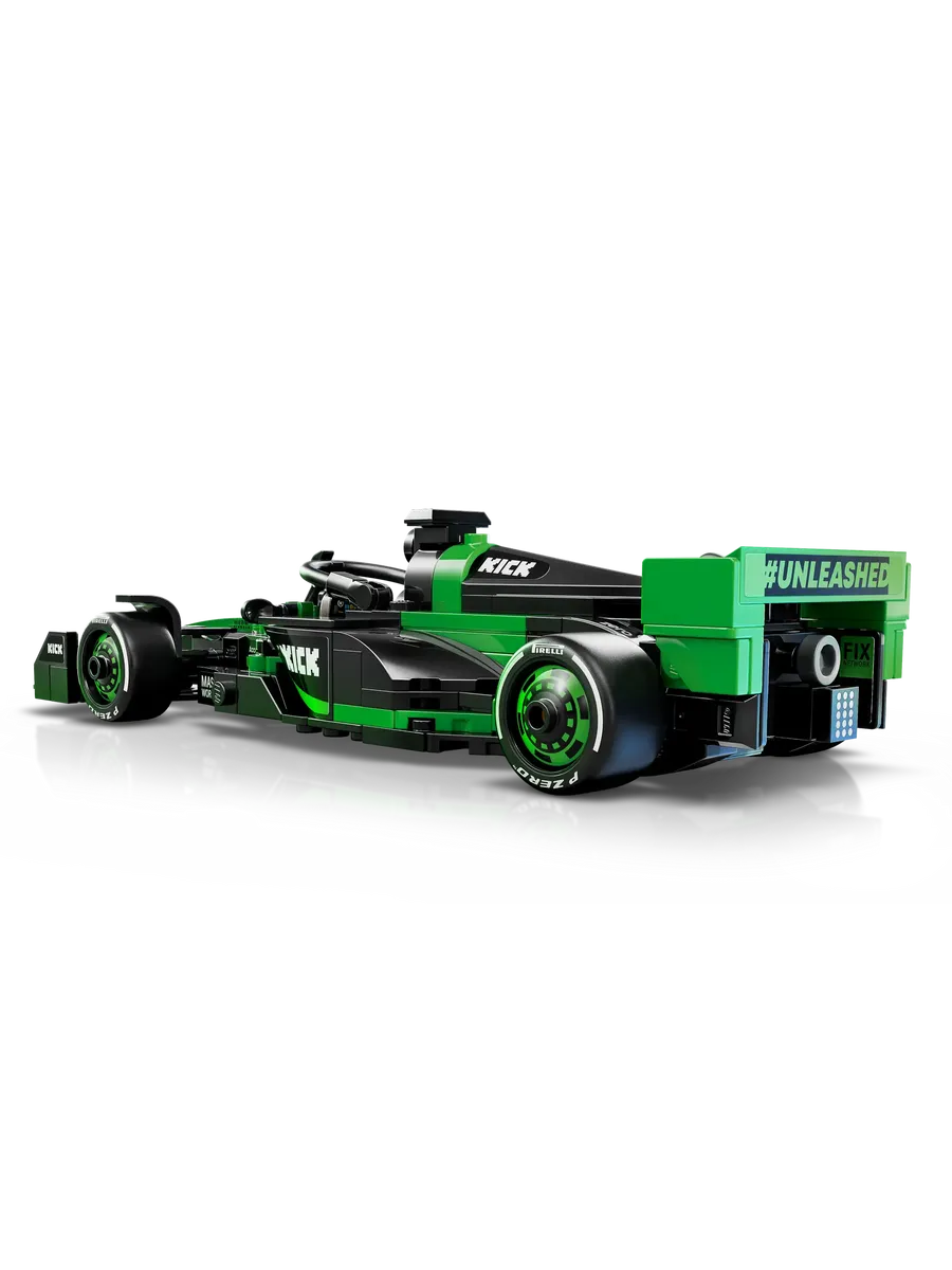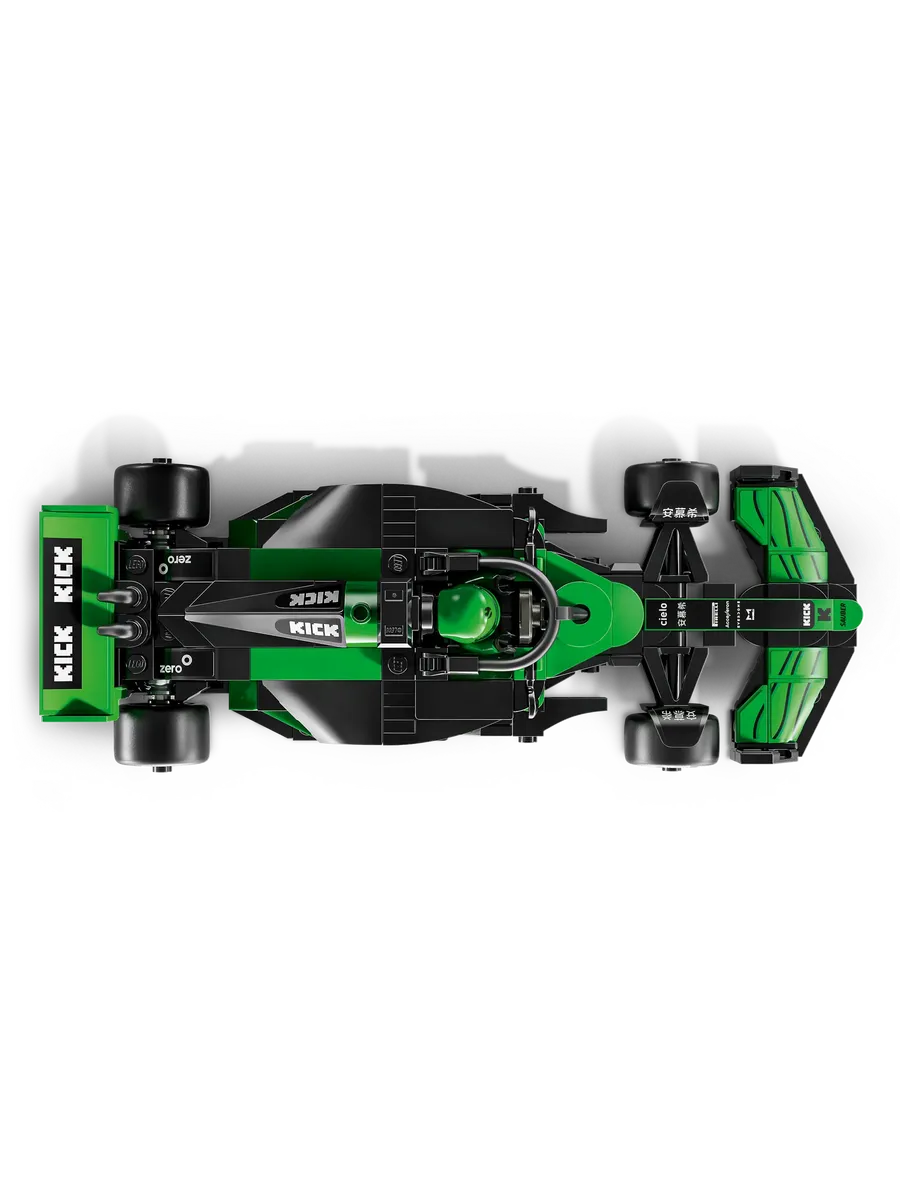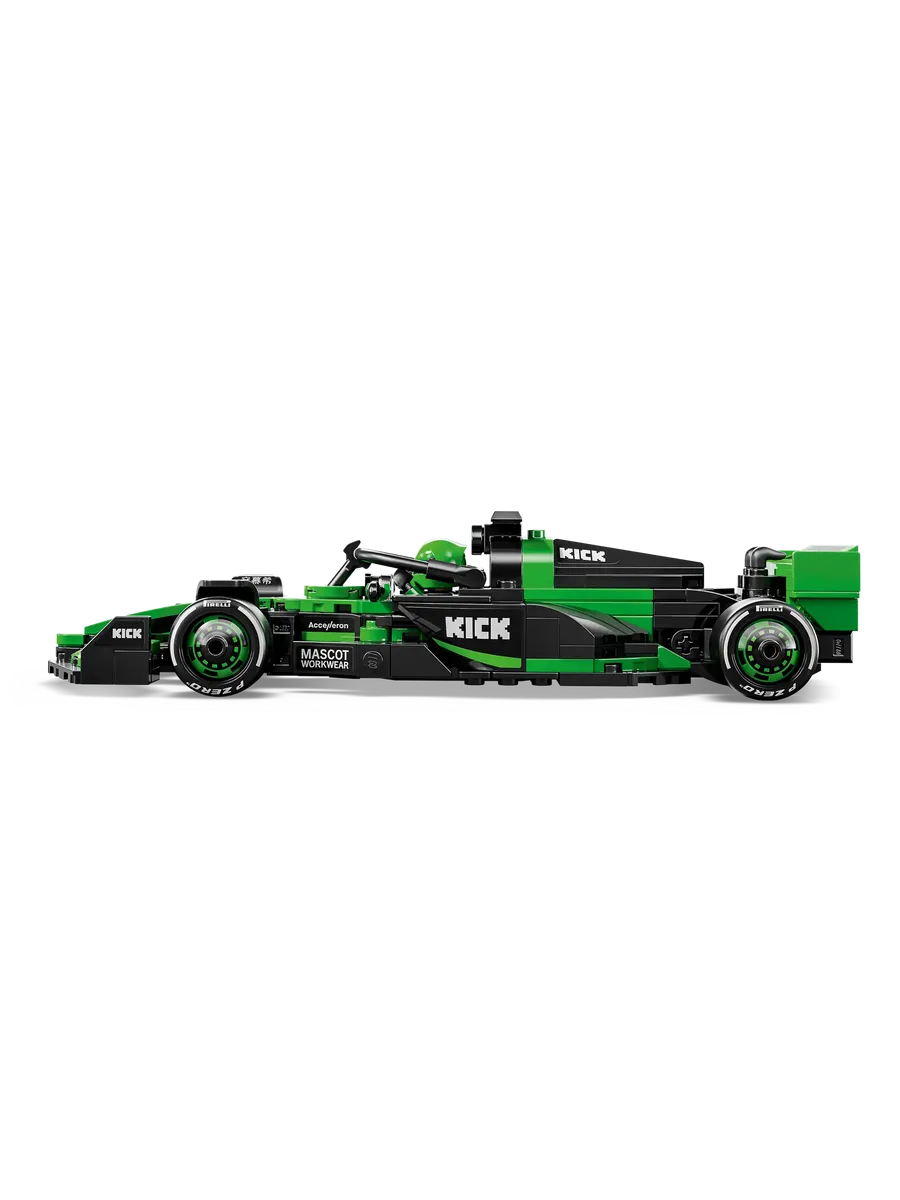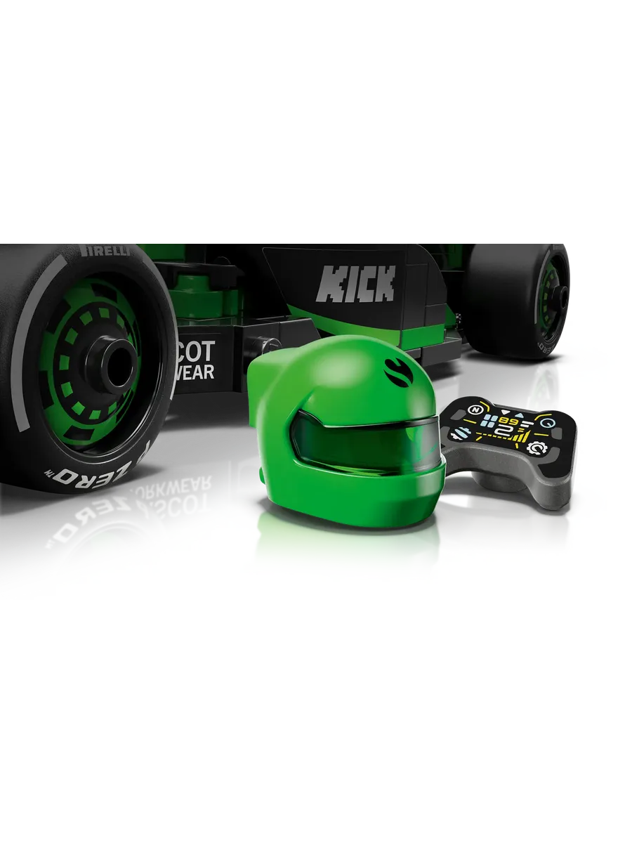 Машина оснащена открывающейся кабиной с защитной дугой Halo, задним антикрылом, рычажной подвеской и широкими задними шинами с логотипом Pirelli. В комплект также входит минифигурка пилота в костюме KICK Sauber F1 и крылатом шлеме, которую можно разместить в кабине для воссоздания гонок.