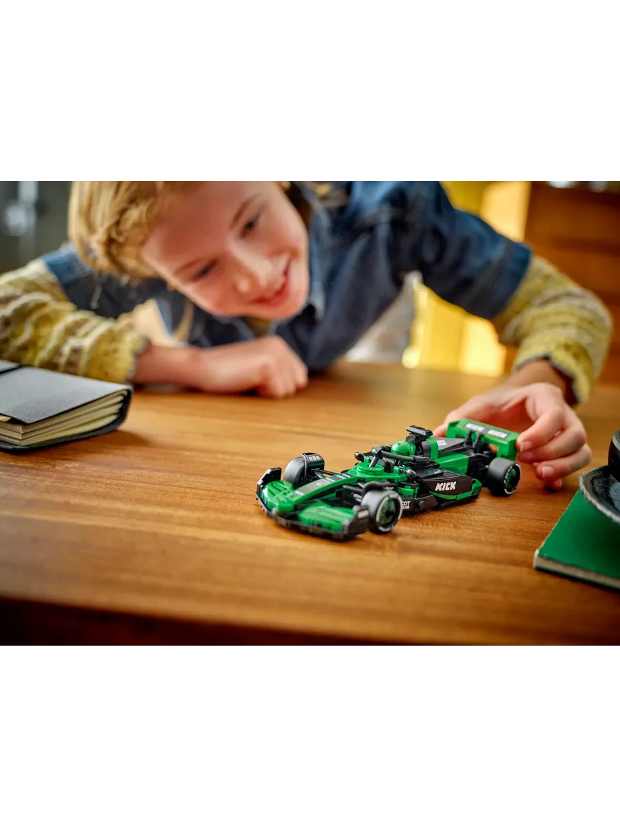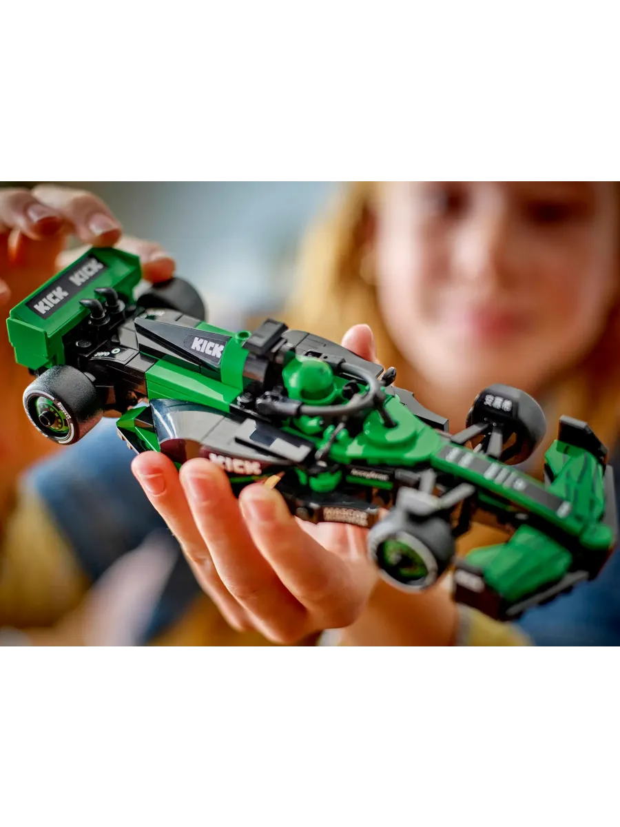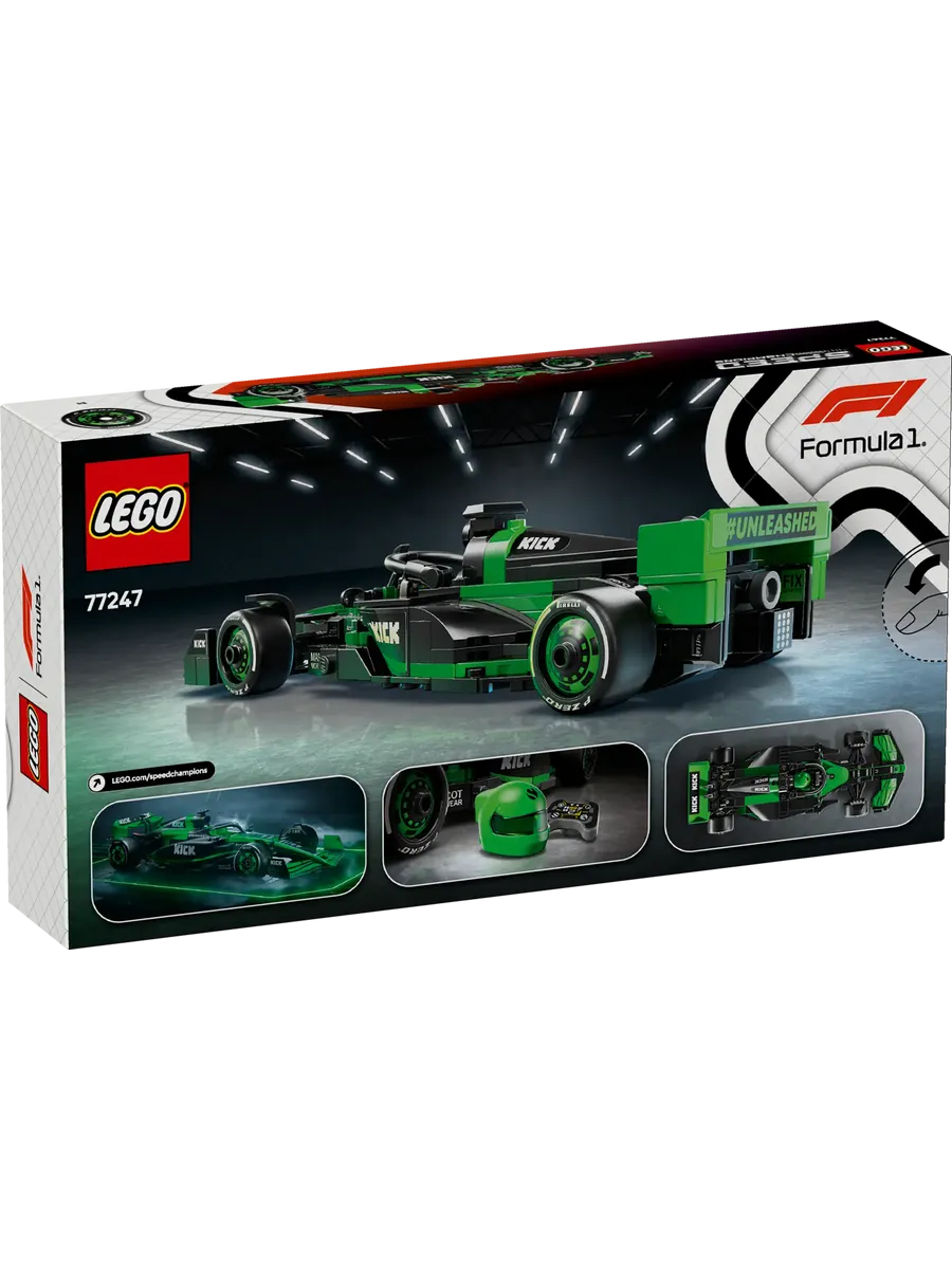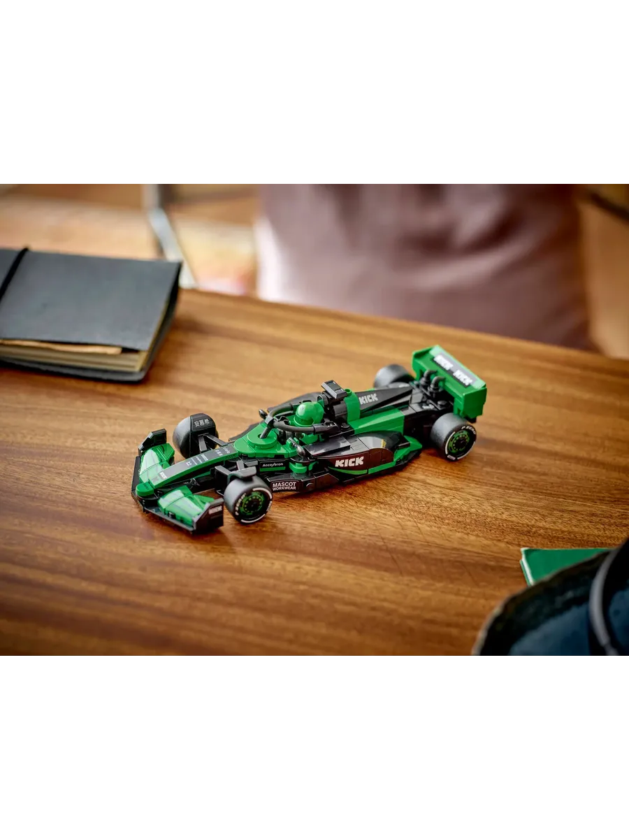 Машина оснащена открывающейся кабиной с защитной дугой Halo, задним антикрылом, рычажной подвеской и широкими задними шинами с логотипом Pirelli. В комплект также входит минифигурка пилота в костюме KICK Sauber F1 и крылатом шлеме, которую можно разместить в кабине для воссоздания гонок.