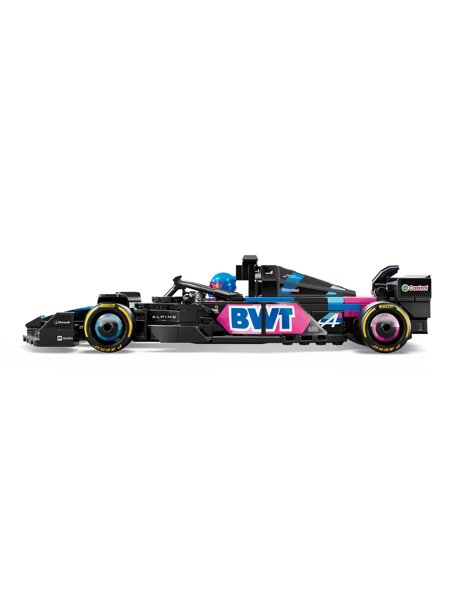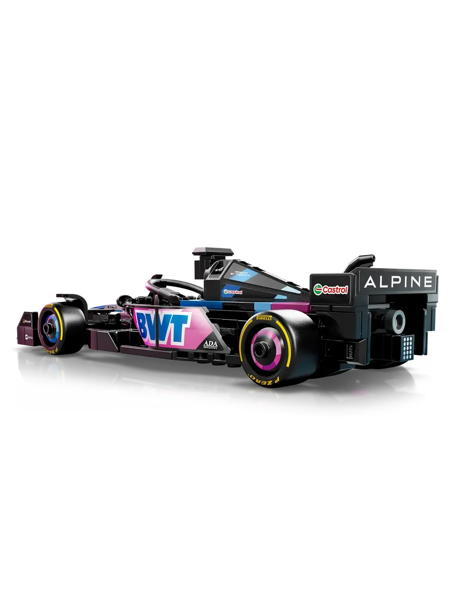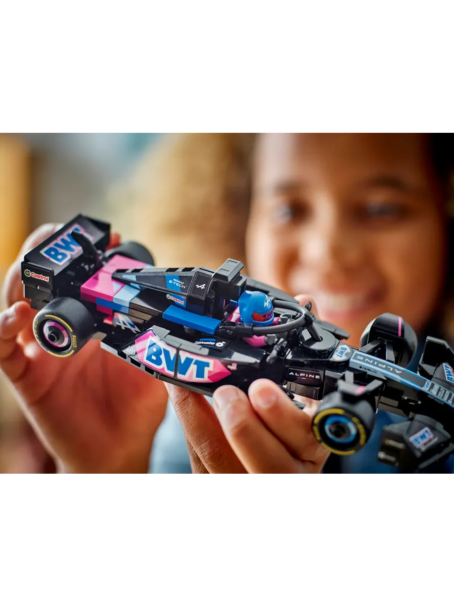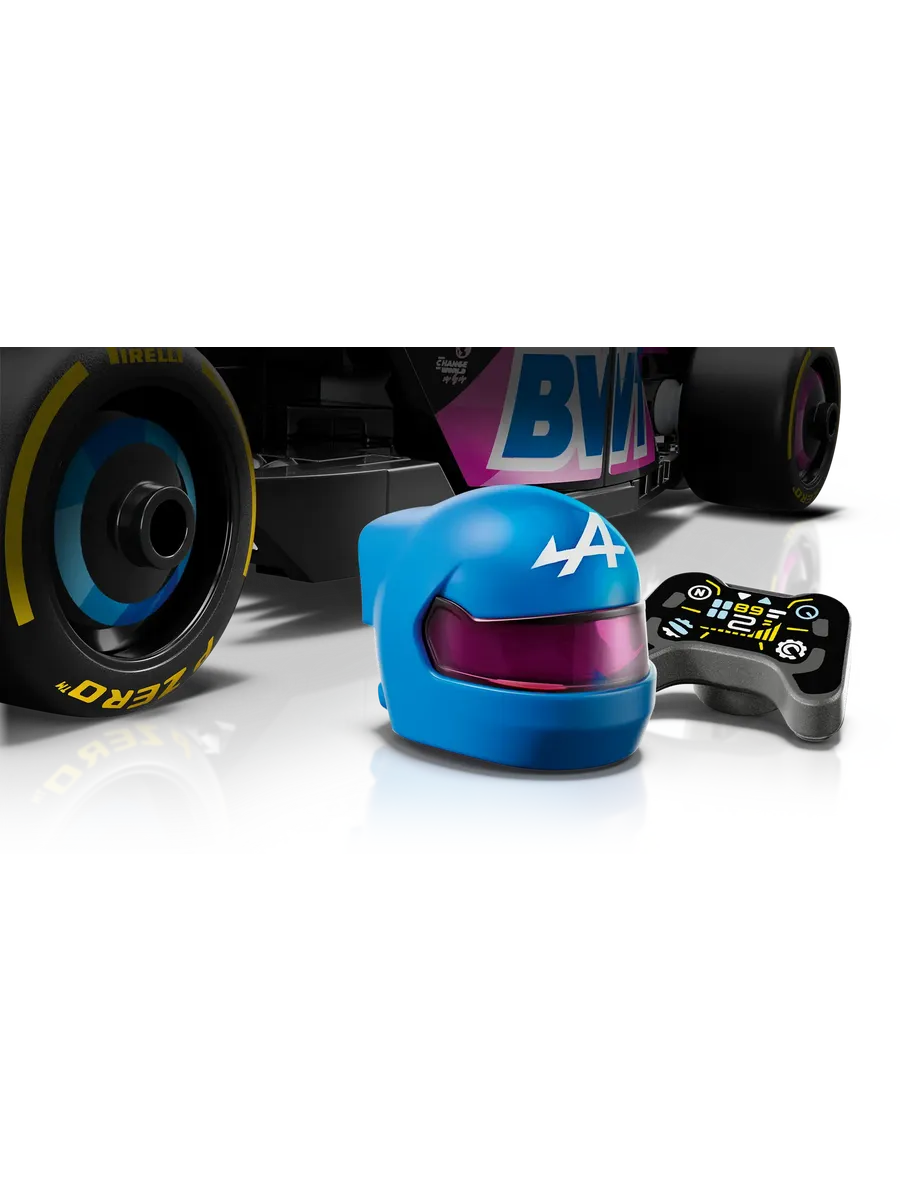 Игрушечный болид оснащен открывающейся кабиной с защитной дугой Halo, задним антикрылом, рычажной подвеской и широкими задними шинами с логотипом Pirelli. В комплект также входит минифигурка пилота в костюме Alpine и крылатом шлеме, которую можно разместить в кабине для реалистичных гоночных сценариев.