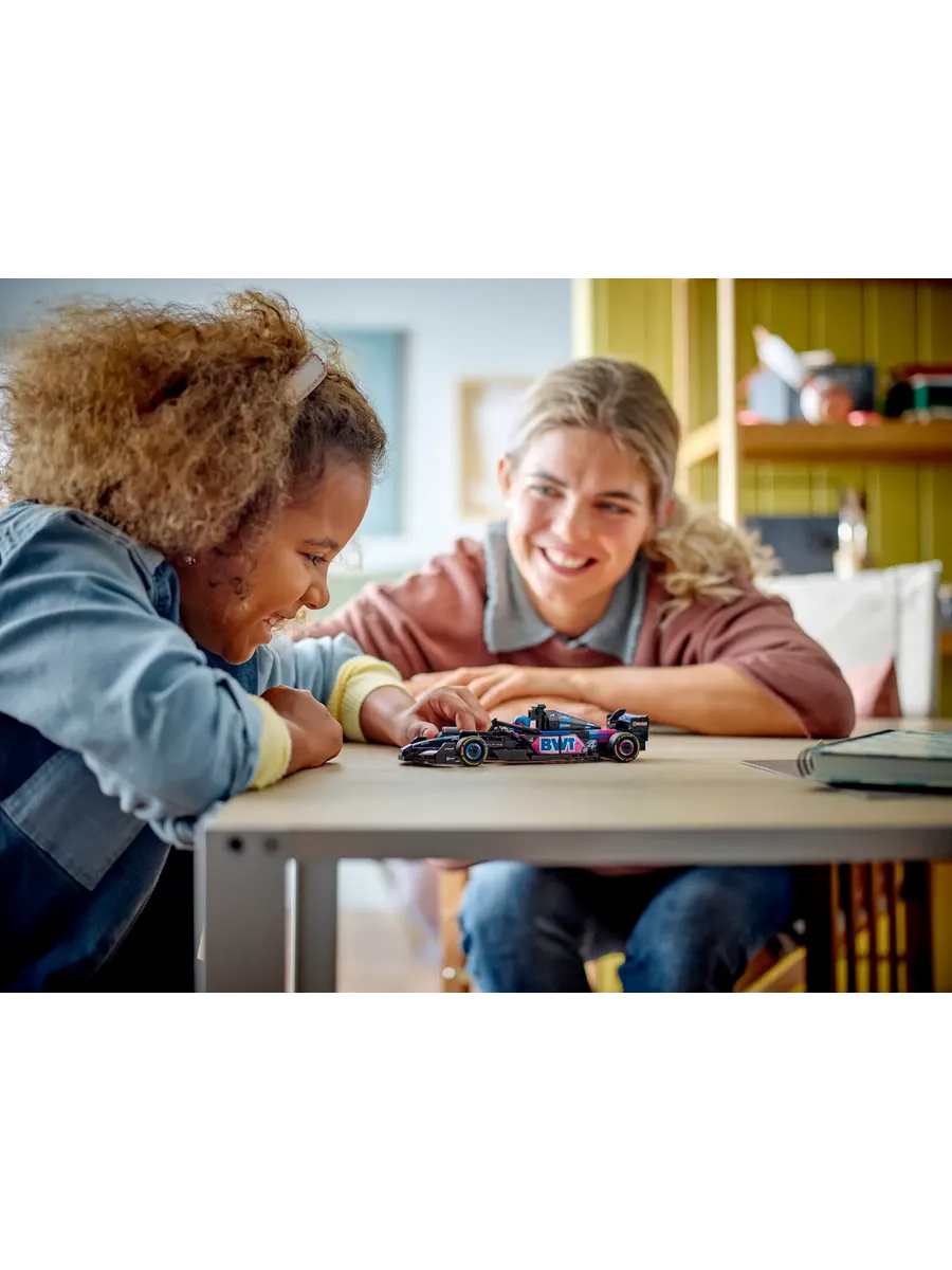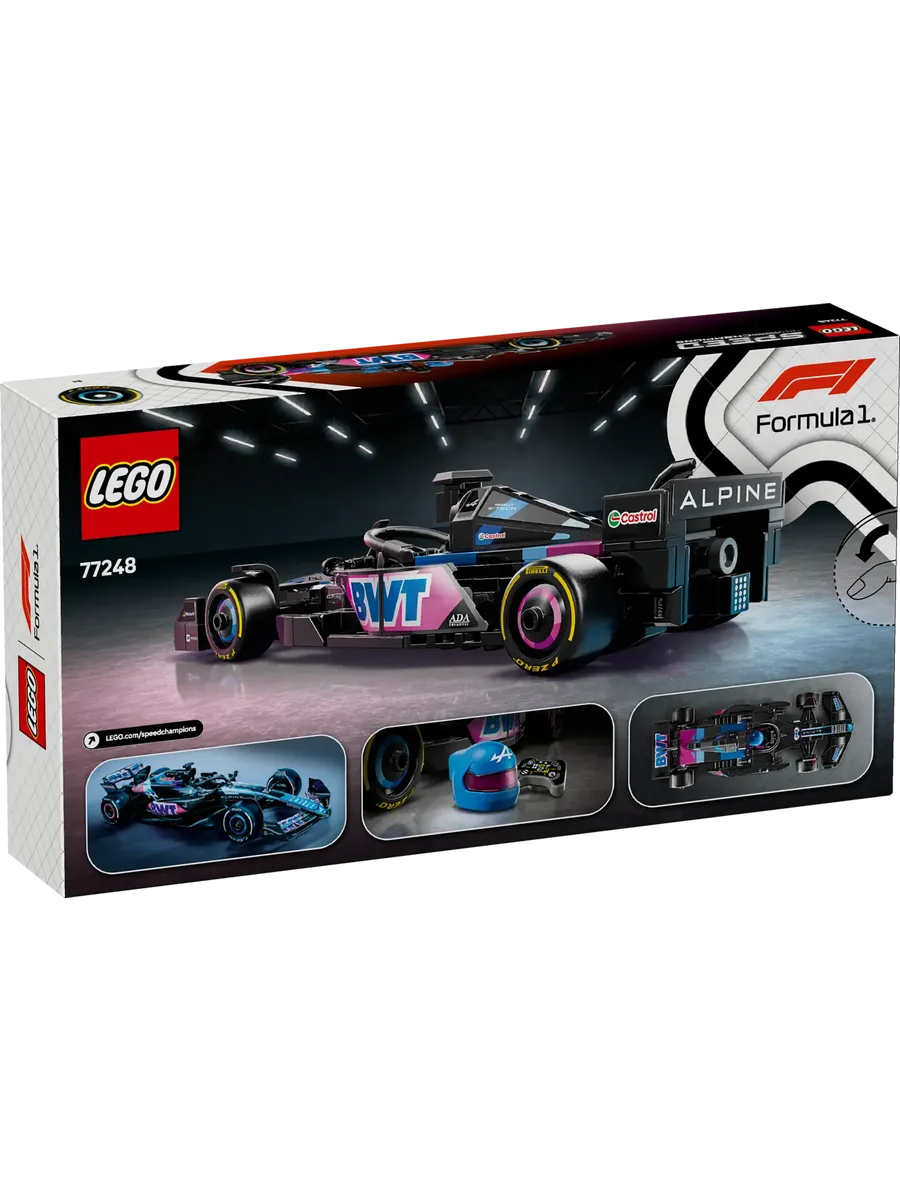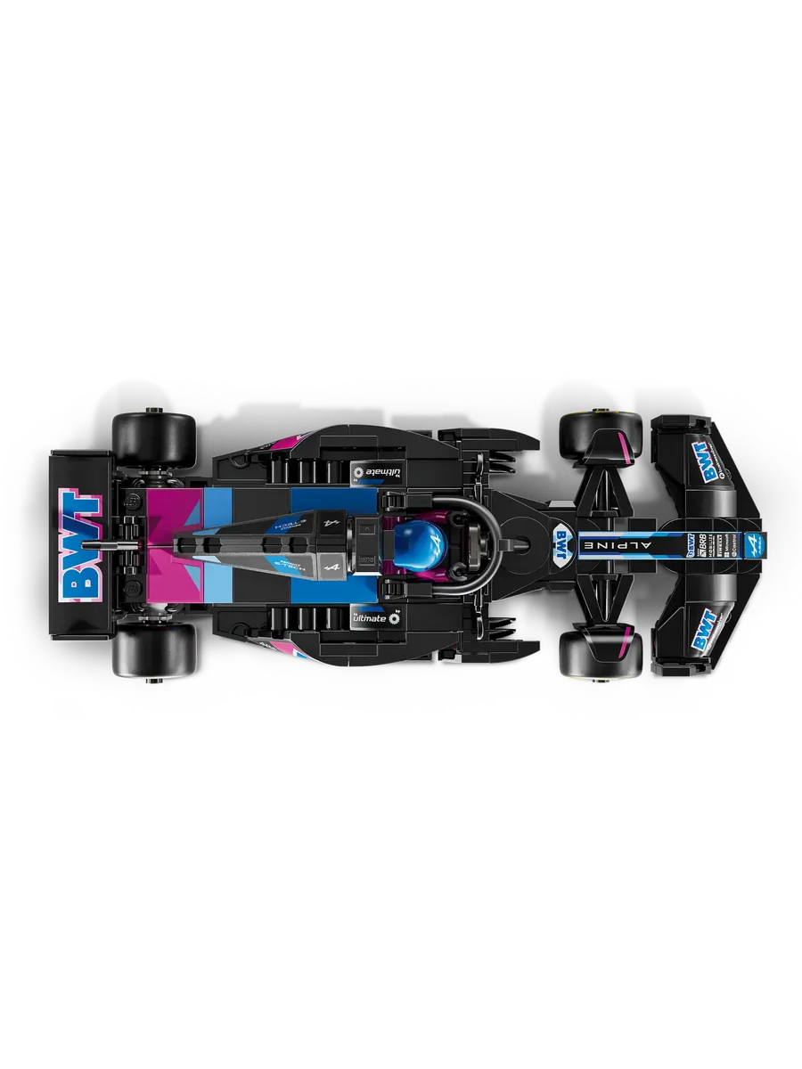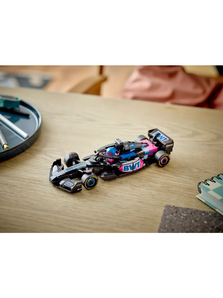 Игрушечный болид оснащен открывающейся кабиной с защитной дугой Halo, задним антикрылом, рычажной подвеской и широкими задними шинами с логотипом Pirelli. В комплект также входит минифигурка пилота в костюме Alpine и крылатом шлеме, которую можно разместить в кабине для реалистичных гоночных сценариев.