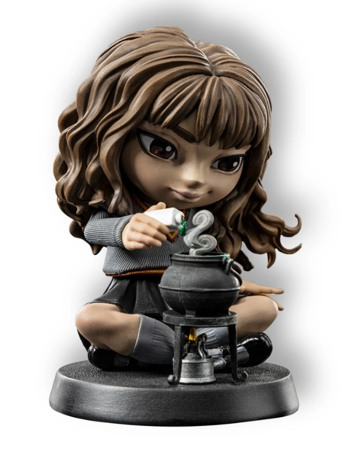 Фигурка выполнена в фирменной серии MiniCo Illusion, которая сочетает компактный формат и атмосферные сценические композиции. Гермиона изображена сидящей с котелком, сосредоточенно добавляющей ингредиенты в зелье. Детализация выполнена на высоком уровне: проработаны школьная форма Хогвартса, аксессуары, поза и мимика персонажа, что позволяет полностью передать атмосферу магического процесса.