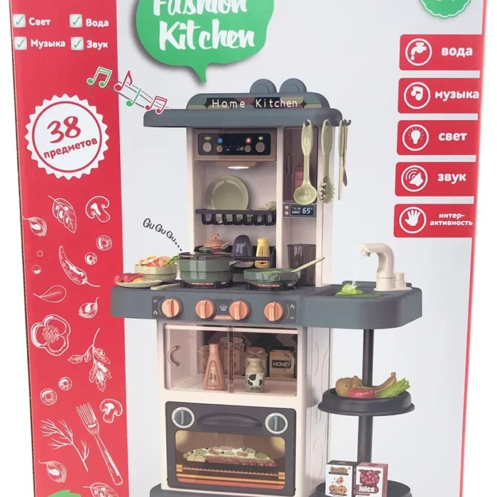 Артикул:FT88330 Комплект: кухня, духовка, сковорода, кастрюлька, блюдце, ложка, нож для еды, овощи. Требуется 6 батареек AA 1,5V (не включены).