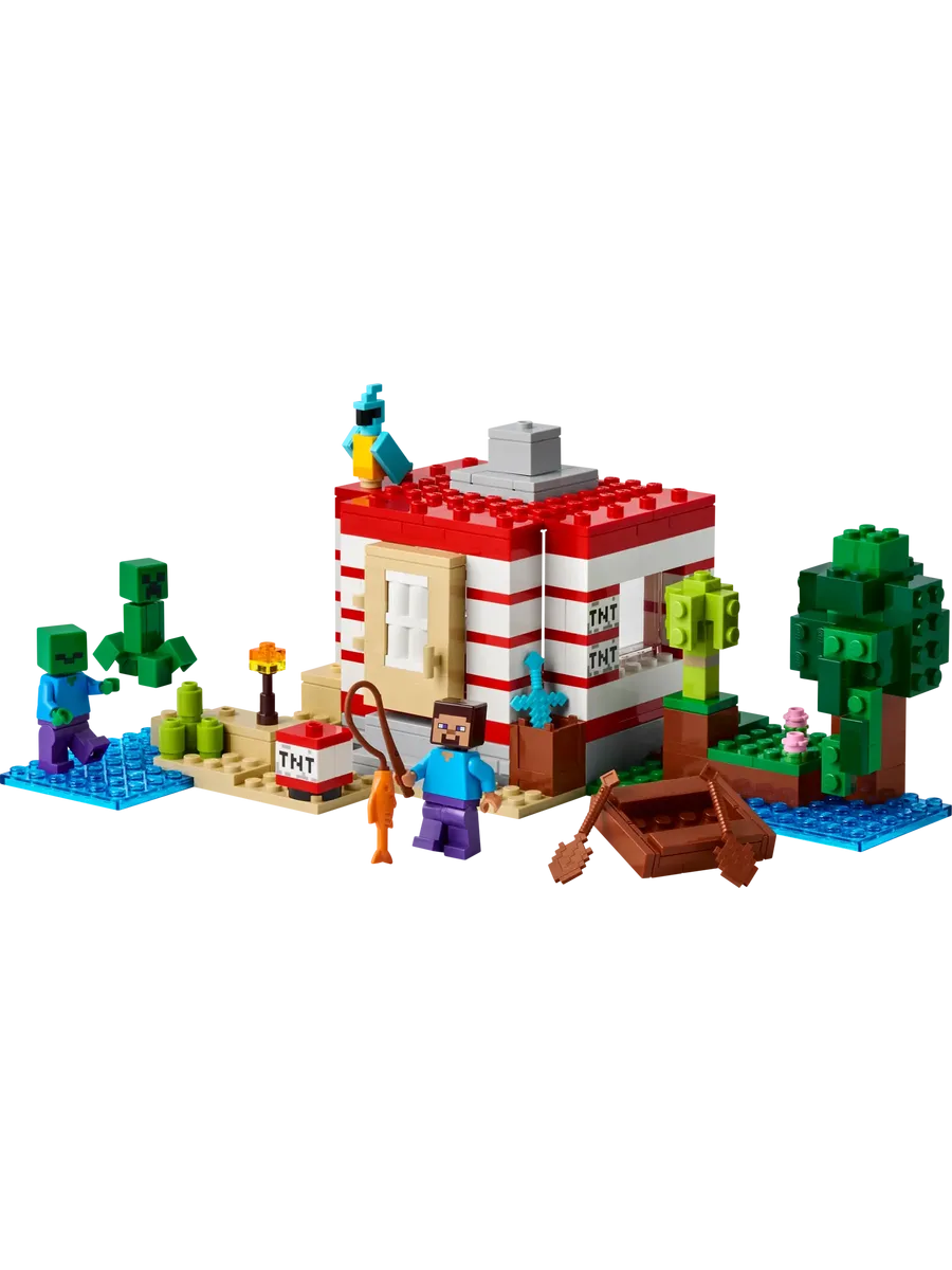 Стив строит убежище прямо в сердце густых джунглей, но опасность подстерегает повсюду — коварный зомби и крипера уже рядом. Как и в игре, не обошлось без ловушки: на боку дома установлен переключатель, который запускает функцию «взрыва» — стены и крыша с грохотом обрушиваются! После этого игрок может снова отстроить здание и придумать новый сценарий для следующей битвы. В комплекте также есть лодка, удочка с рыбой, попугай и элементы тропической растительности, чтобы сделать мир игры ещё живее.