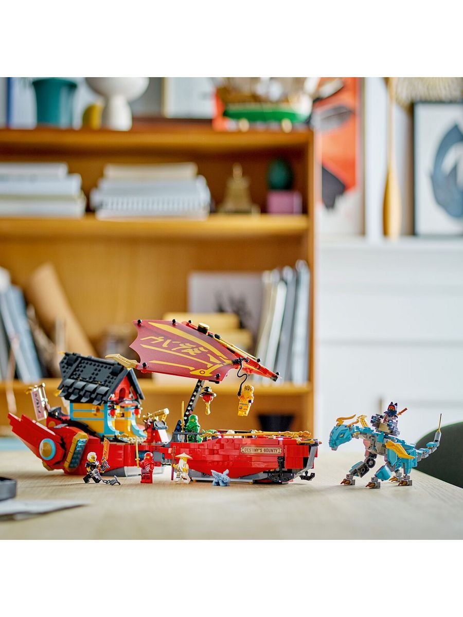 Дети старше 9 лет могут отправиться в воздушные приключения с этим недавно обновленным игровым набором Destiny’s Bounty – гонка на время (71797). 6 минифигурок – дирижабль поставляется с мастером Ву, Арином, Сорой, Минифигурки Ллойда, Кая и Рэптона, все из которых вооружены как минимум 1 оружием для ролевых сражений. 2 игрушки-дракона – в игровой набор премиум-класса входит возможный элементальный дракон, гнездящийся в передней части дирижабля, чтобы помочь ему управлять им, а также модель малышки Рию. Функции дирижабля – Обновленный боевой корабль Destiny’s Bounty оснащен стрелками-гвоздиками сзади, регулируемыми парусами и двигателями, вращающимися на 360 градусов. Съемная крыша – поднимите крышу, чтобы открыть навигационную комнату и игровую комнату с аркадным автоматом для ниндзя. Количество деталей: 1739 шт.Размер упаковки: 8,7 * 58,2 * 37,8 см.Вес: 2,3 кг.