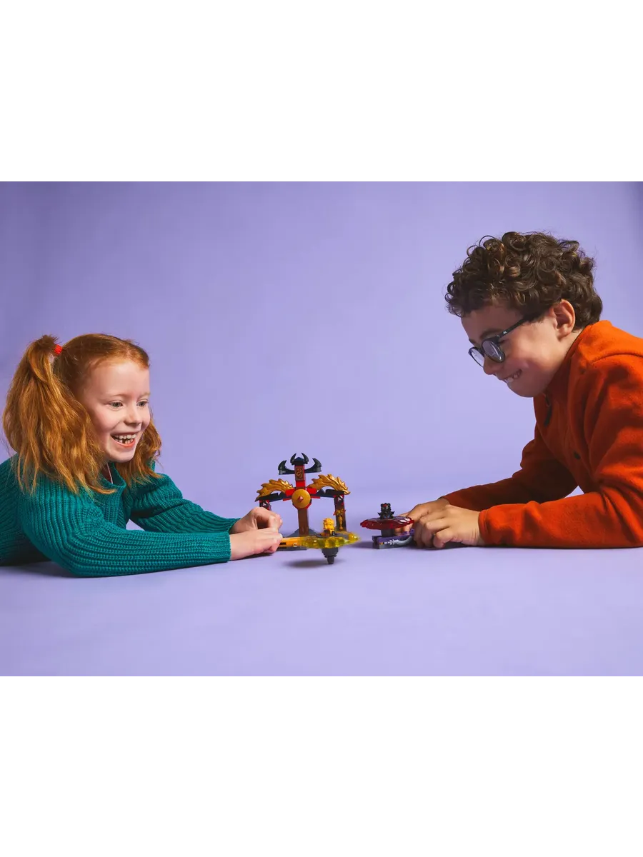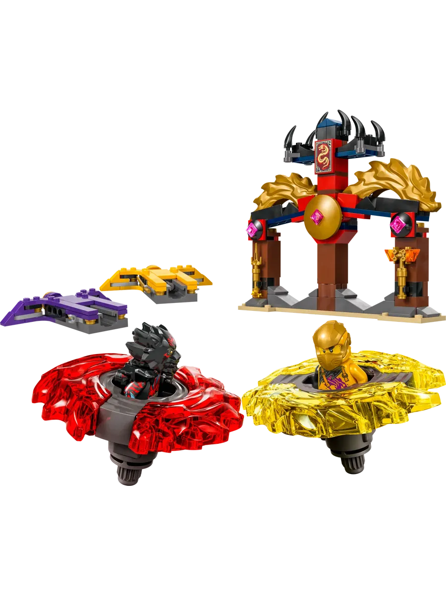 Динамичный «Боевой набор драконов Кружитцу» (71826) позволяет мальчикам и девочкам в возрасте от 6 лет разыгрывать захватывающие приключения из третьего сезона сериала «Ниндзяго: Восстание драконов». В этом небольшом наборе LEGO есть храм с боевой ареной, минифигурки Арина и Раса и два игрушечных спиннера драконов Кружитцу, которые дети могут поместить в пусковые установки и запустить в крутящиеся битвы друг с другом. Дети смогут насладиться ролевой игрой, устраивая схватки добра со злом — битвы желтого спиннера Арина и красного спиннера Раса, у которых есть съемные силовые элементы. Персонажи NINJAGO могут улучшать свои спиннеры золотыми элементами, которые можно получить, врезаясь и разрушая арену для битвы. В ассортименте наборов и боевых игрушек LEGO NINJAGO (продаются отдельно) есть роботы, драконы и техника, чтобы поклонники серии могли разыгрывать истории о ниндзя. Каждый игровой набор с ниндзя можно собрать при помощи приложения LEGO Builder, которое сделает сборку для вас и вашего ребенка легкой, интуитивно понятной и особенно увлекательной.