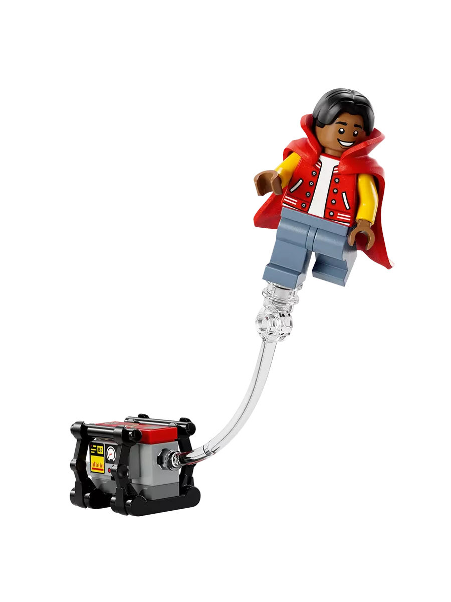 Модель разработана так, чтобы впечатлять с любого ракурса. Три прозрачные стойки «поднимают» минифигурки в воздух, создавая иллюзию полёта. Съёмная крыша открывает руку Песочного человека, готового атаковать. Сзади скрывается портал, через который могут прийти союзники… или враги. А мягкий элемент паутины позволяет «связать» злодеев и остановить их.