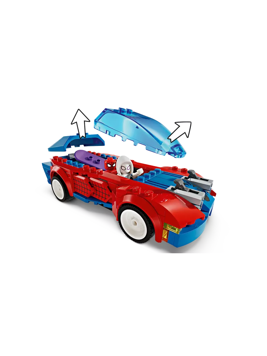 Человек-паук мчится в бой на своём гоночном автомобиле с двумя передними шутерами, раскачивается на гибкой паутинной «веревке» и выпускает огромную паутину, чтобы поймать врагов. Его салон открывается и вмещает не только самого героя, но и его напарника вместе со скейтбордом.