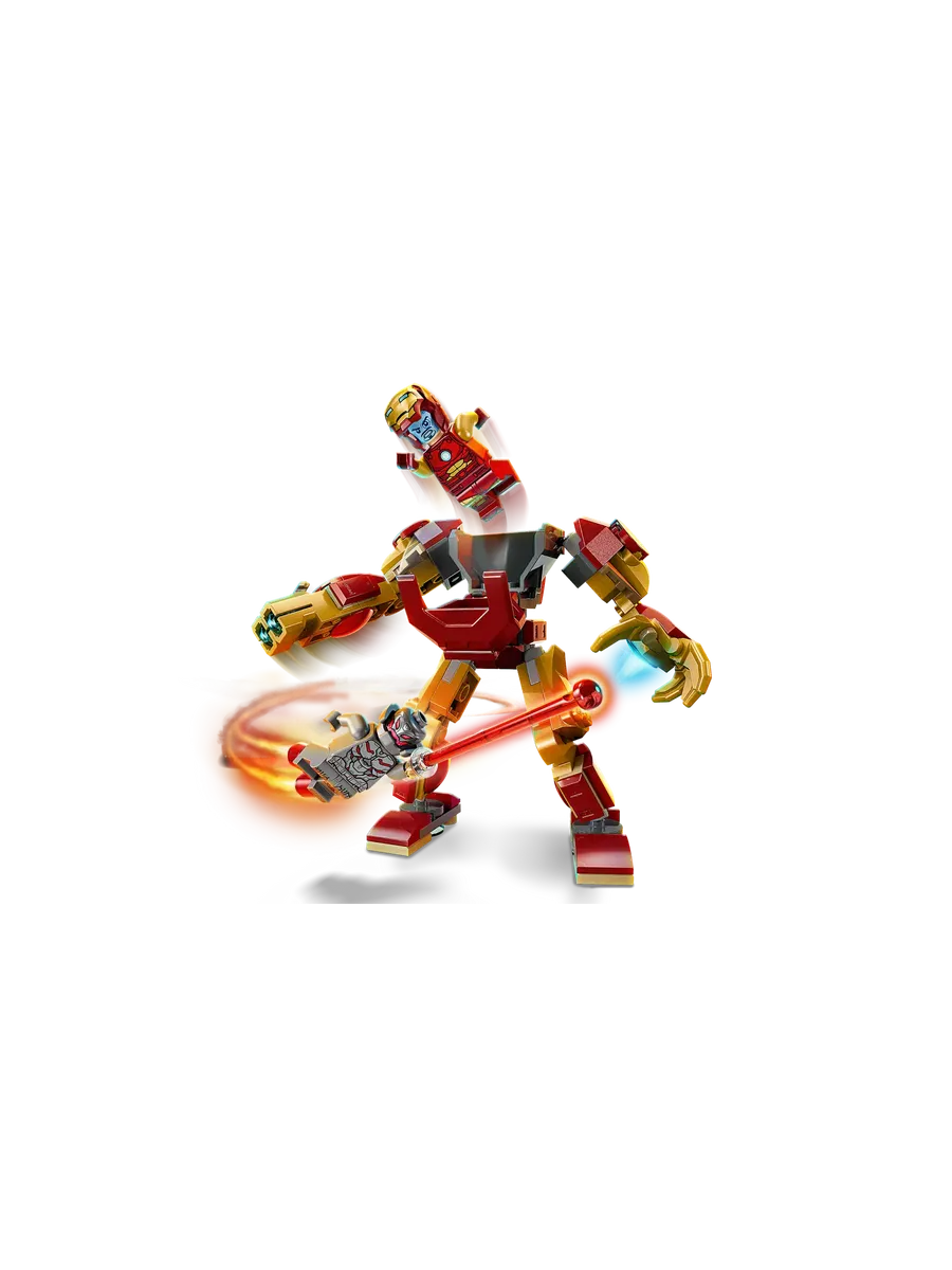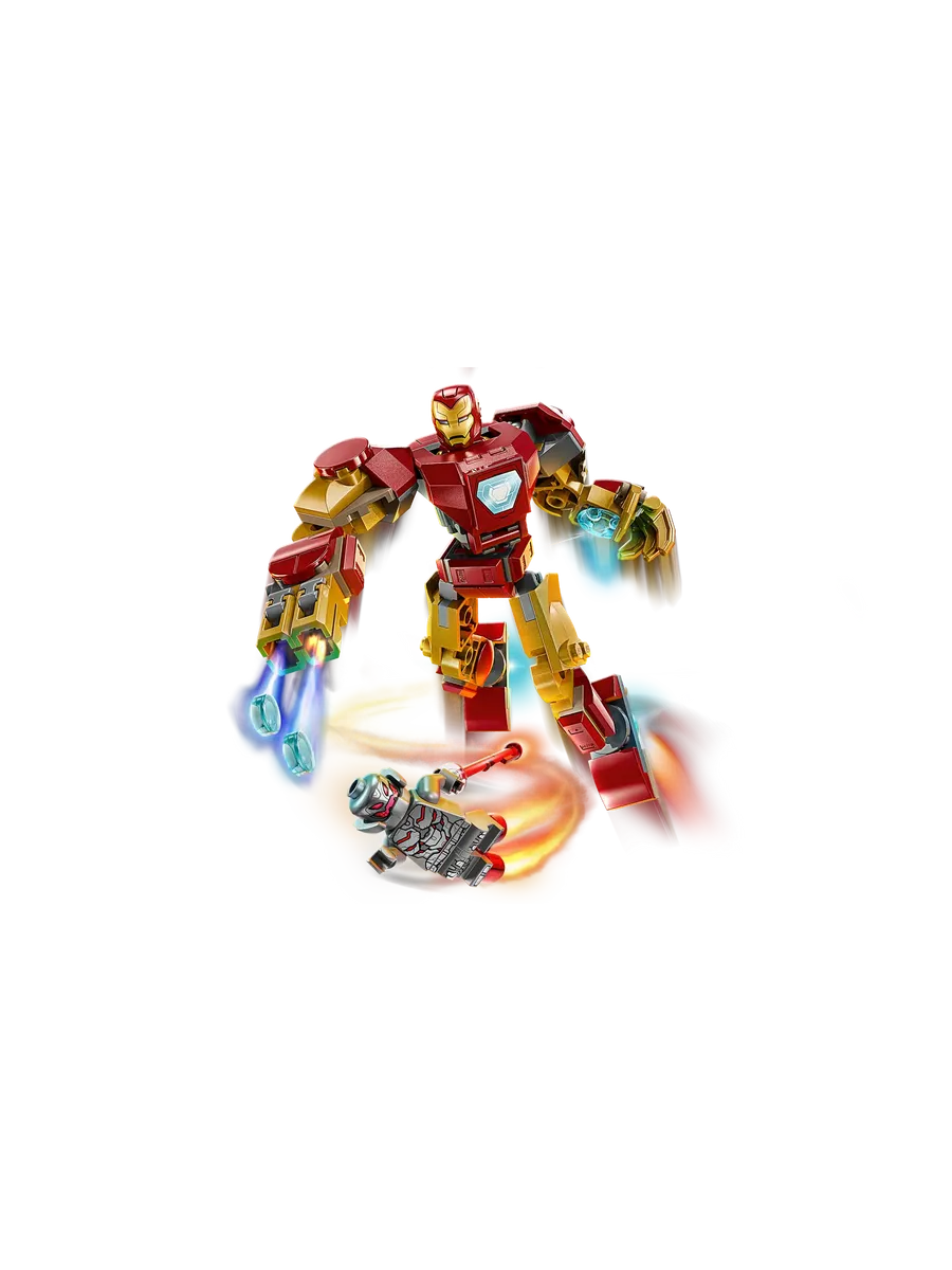 Минифигурка Тони Старка готова к бою: его шлем открывается, а голова переворачивается, чтобы менять выражение лица — спокойное или боевое. Посадите его в кабину огромного робота, которая открывается прямо в туловище. Робот вооружен шипометом на правой руке, а его подвижные руки, ноги и пальцы позволяют принять любую боевую стойку.
