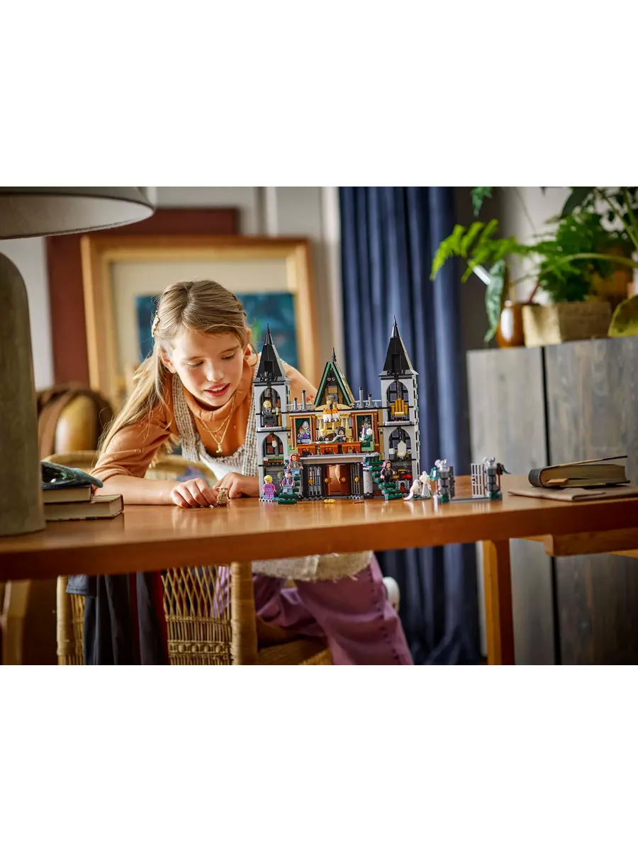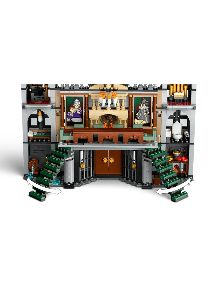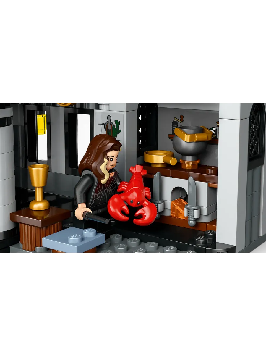 Величественный особняк Драко Малфоя выполнен с удивительной детализацией: массивные ворота, замысловатая архитектура и тщательно проработанные комнаты делают его не только игровым набором, но и эффектной моделью для демонстрации. Внутри вы найдете гостиную с длинным столом и падающей люстрой — помните момент, когда Добби спасает своих друзей? Спальня Драко, кухня, ванная и подвал, где заточены Гарри и его друзья, дополняют обстановку.