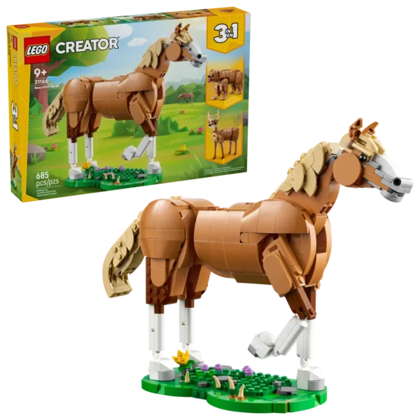 LEGO «Красивая лошадь» (31166) — три истории в одной модели! Представьте, как вы соединяете 685 деталей и создаёте потрясающую фигурку лошади на травяной подставке, у которой гибкие шея, ноги, хвост и даже колено. Лошадь можно поставить на три ноги, четыре или в стойку на дыбах — идеальная поза для динамичного декора или игрового момента.