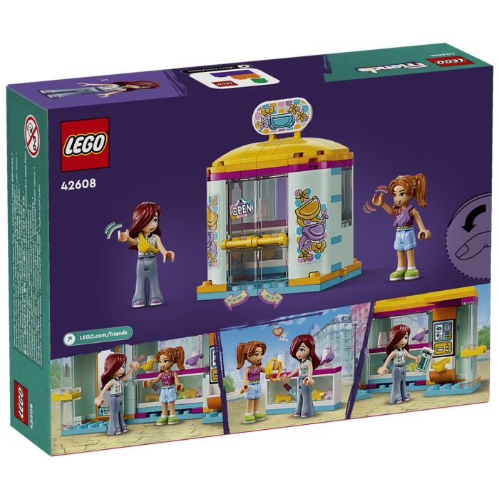 Добро пожаловать в уютный магазин аксессуаров LEGO Friends (42608), где Пейсли и Кэнди выбирают стильные обновки! Здесь можно примерить новые сумочки, украсить прическу модными аксессуарами и оценить образ в зеркале. А когда выбор сделан, остается только оплатить покупки на кассе самообслуживания с помощью смартфона.