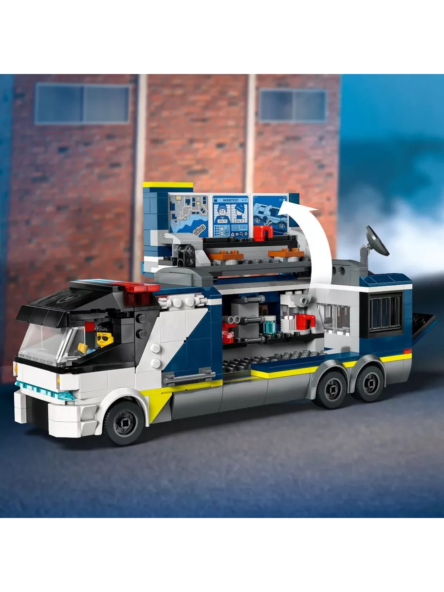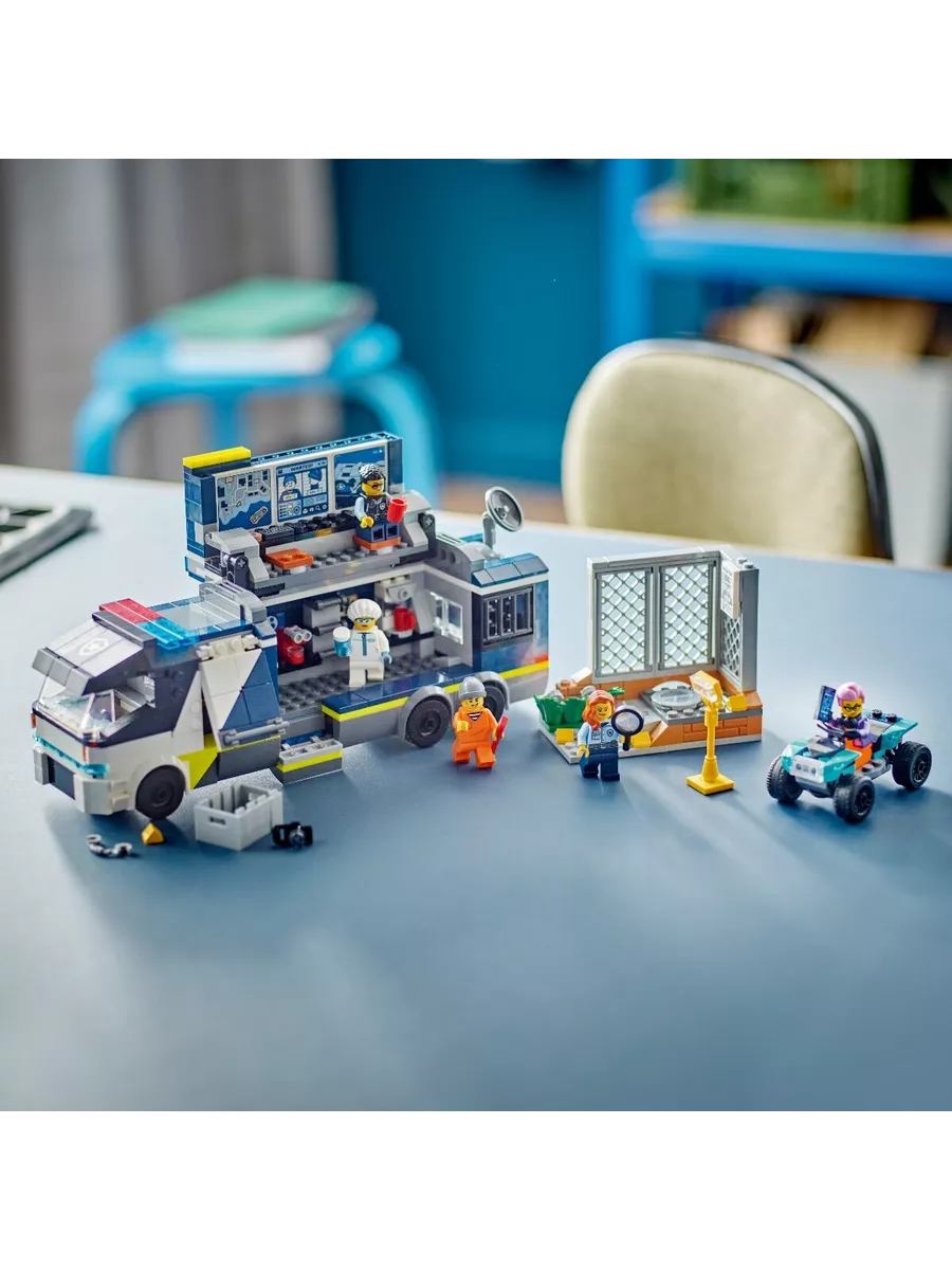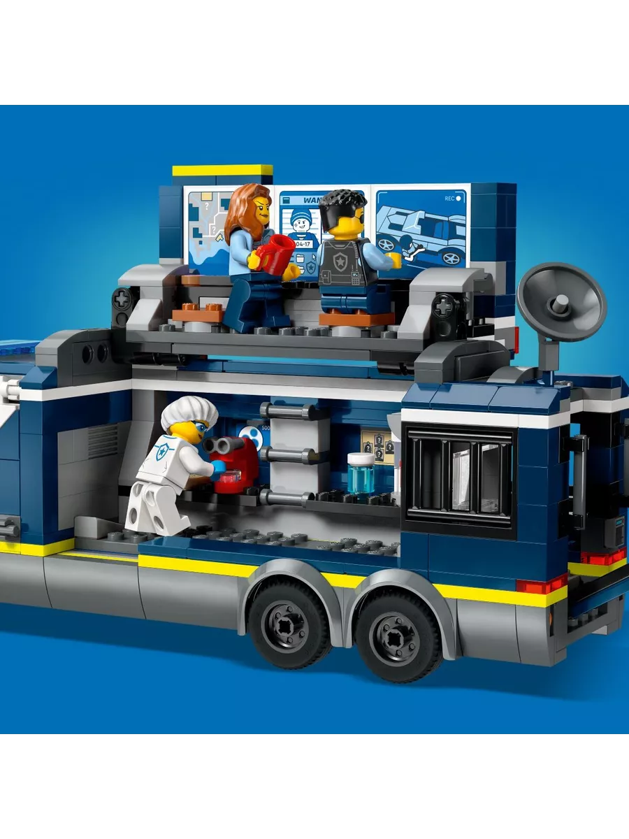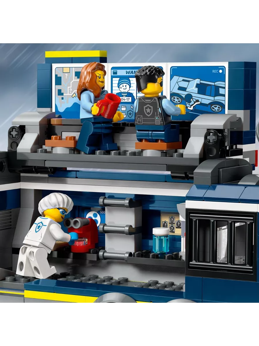 Этот оригинальный конструктор LEGO позволяет разыгрывать сцены погони за преступниками и сбора улик. В наборе есть мобильная криминалистическая лаборатория, которая открывается, превращаясь в двухуровневый центр расследований. Внутри дети найдут рабочие станции с картами, экранами видеонаблюдения, микроскопом и даже кофемашиной. В трейлере также есть тюремная камера для задержанных.