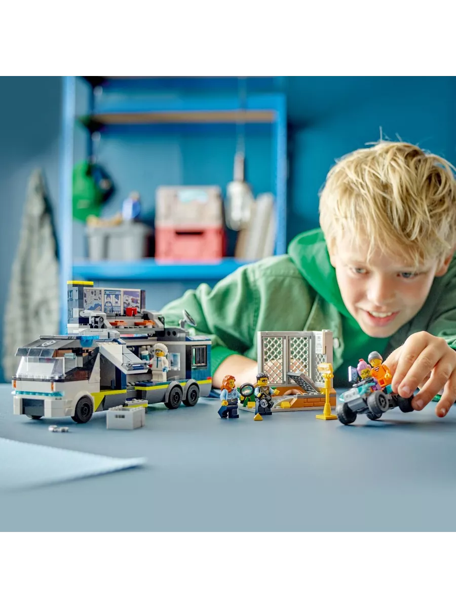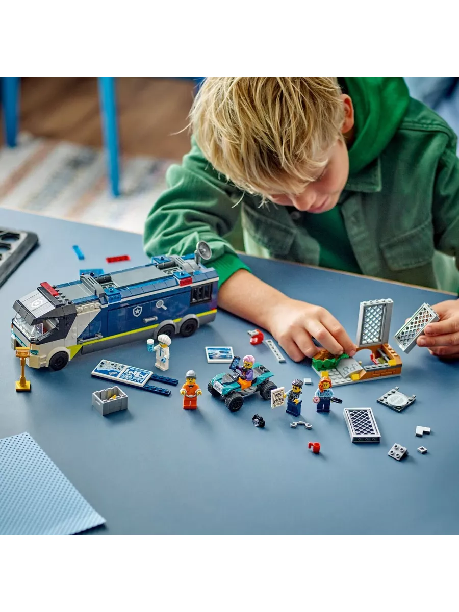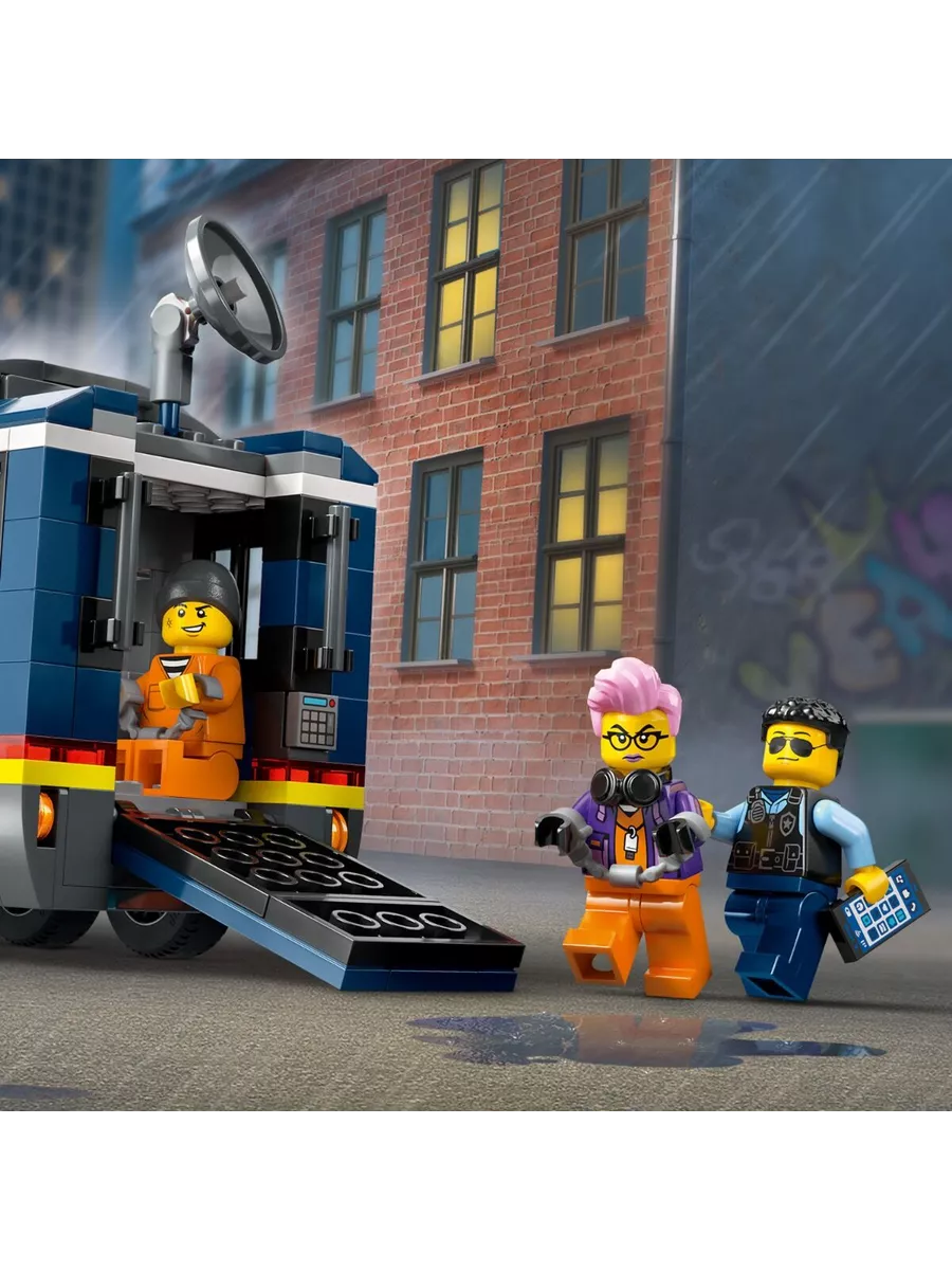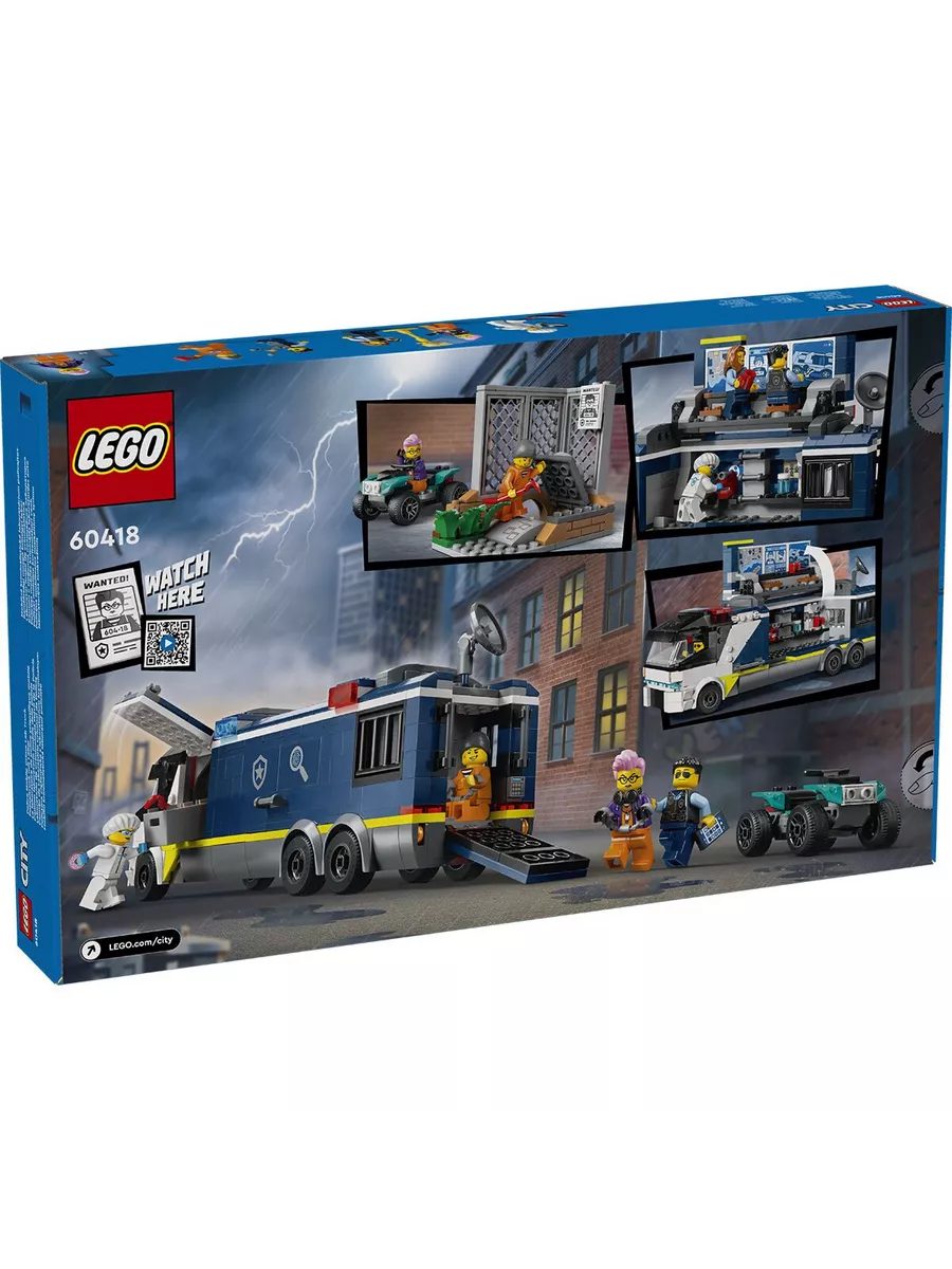 Этот оригинальный конструктор LEGO позволяет разыгрывать сцены погони за преступниками и сбора улик. В наборе есть мобильная криминалистическая лаборатория, которая открывается, превращаясь в двухуровневый центр расследований. Внутри дети найдут рабочие станции с картами, экранами видеонаблюдения, микроскопом и даже кофемашиной. В трейлере также есть тюремная камера для задержанных.