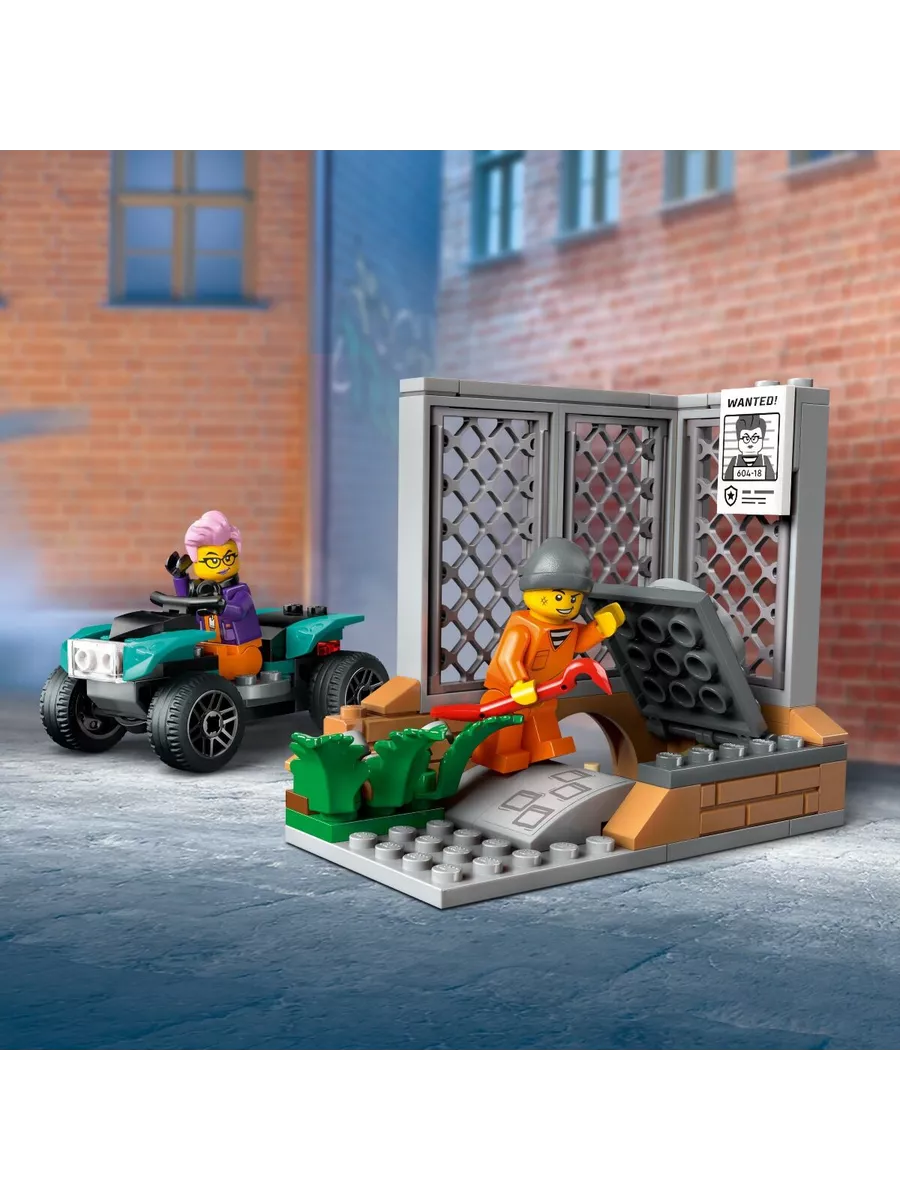 Для полноценной игры в комплект входят минифигурки двух полицейских, ученого-криминалиста и двух преступников, а также квадроцикл для побега и место преступления, где можно собирать улики. Дети смогут раскрывать преступления, анализировать следы и устраивать захватывающие погони.