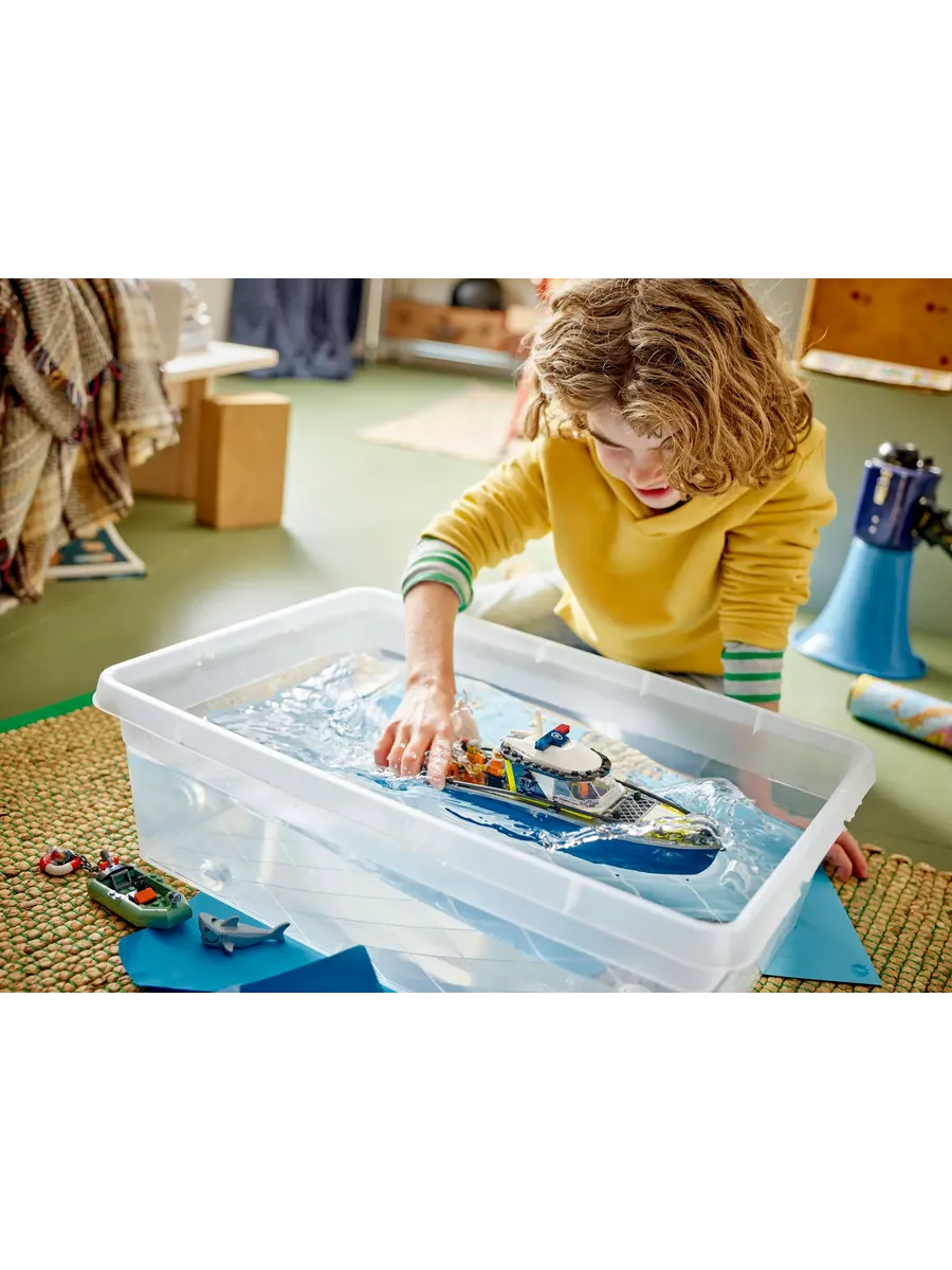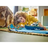 Полицейский катер вмещает двух фигурок и имеет доступ к камере, где можно запереть преступника. Обе лодки действительно держатся на воде, поэтому с этим набором можно играть не только на суше, но и в ванной или бассейне. Сценариев — бесконечное множество: от поимки на месте преступления до хитрых побегов и опасных морских схваток.