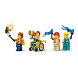 В центре набора — высокая рампа, откуда стартуют сразу два эксцентричных болида: гоночный хот-дог и… туалет на колёсах. Дети устанавливают их на вершине трассы, активируют специальный рычаг — и машинки устремляются вниз, демонстрируя головокружительные трюки. В комплект входят четыре минифигурки, включая продавца хот-догов и сантехника, которые выступают в роли отважных гонщиков. Весёлые аксессуары — кубок победителя, селфи-палка, инструментальная стойка и инвалидное кресло — подчеркивают игровой потенциал и добавляют шутливых деталей.