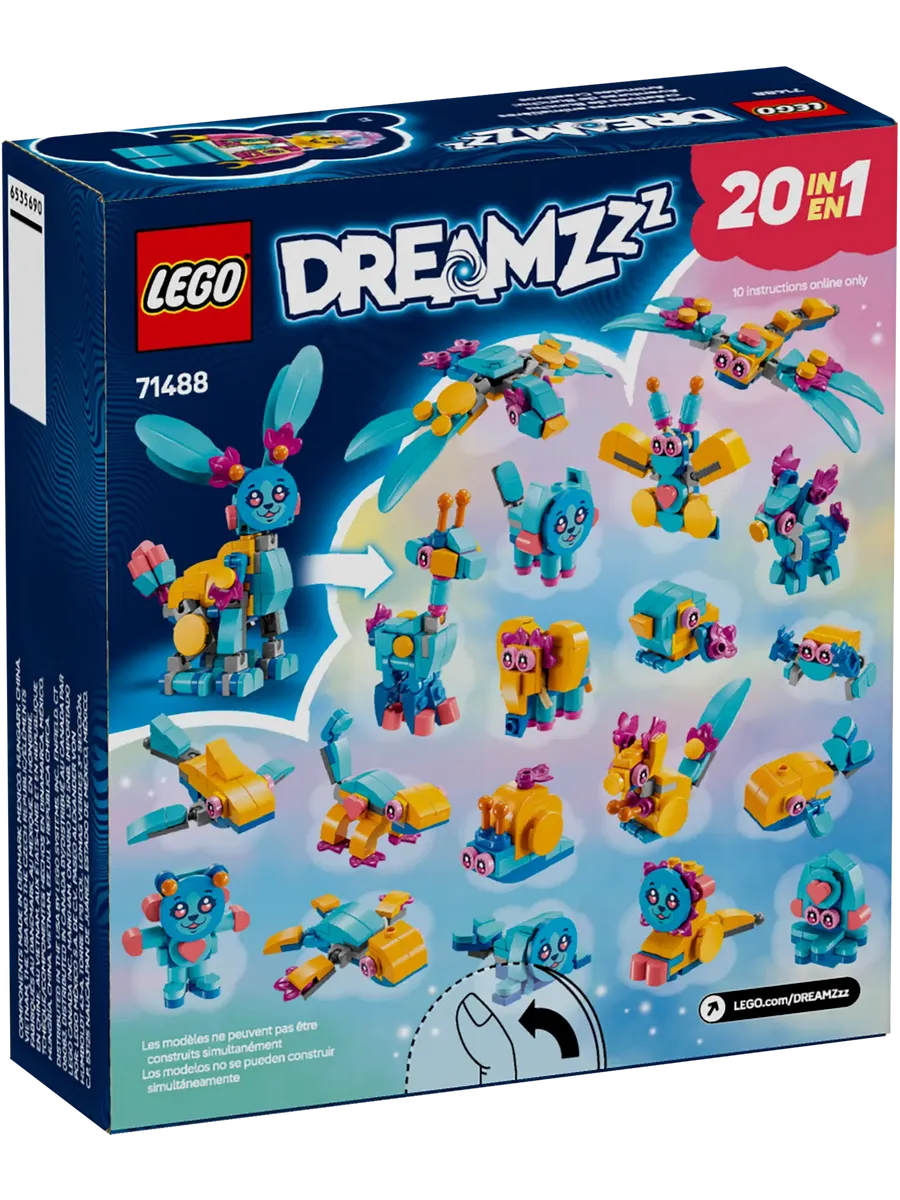Со строительным набором для девочек и мальчиков «Приключения творческих животных Банчу» LEGO DREAMZzz (71488) дети могут с головой погрузиться в грезы. Эта удивительная игрушка полна возможностей, и она позволит юным фантазерам в возрасте от 7 лет изучить 20 захватывающих способов собрать Банчу. Пусть детская фантазия вырвется на волю: ребенку предстоит собрать милую фигурку кролика Банчу с подвижными руками, ногами, ступнями, хвостом и ушами, а потом перестроить ее в любое из 19 крутых игрушечных животных. Среди вариантов сборки есть лев, черепаха, олень, бабочка, стрекоза и многие другие! Минифигурка Иззи в новом наряде и с аксессуаром в виде плюшевой игрушки оживляет этот фантазийный набор с животными и вдохновляет на творческую ролевую игру, когда дети придумывают новые приключения для героини LEGO DREAMZzz и ее кролика. Эта игрушка для сборки станет отличным подарком для детей и поклонников сериала LEGO DREAMZzz. В наборе есть инструкции по сборке с историей, чтобы юные мечтатели могли погрузиться в волшебство Мира Снов и насладиться часами увлекательной сборки.