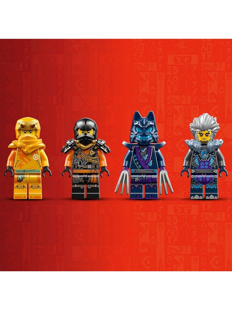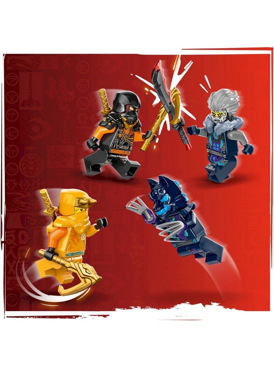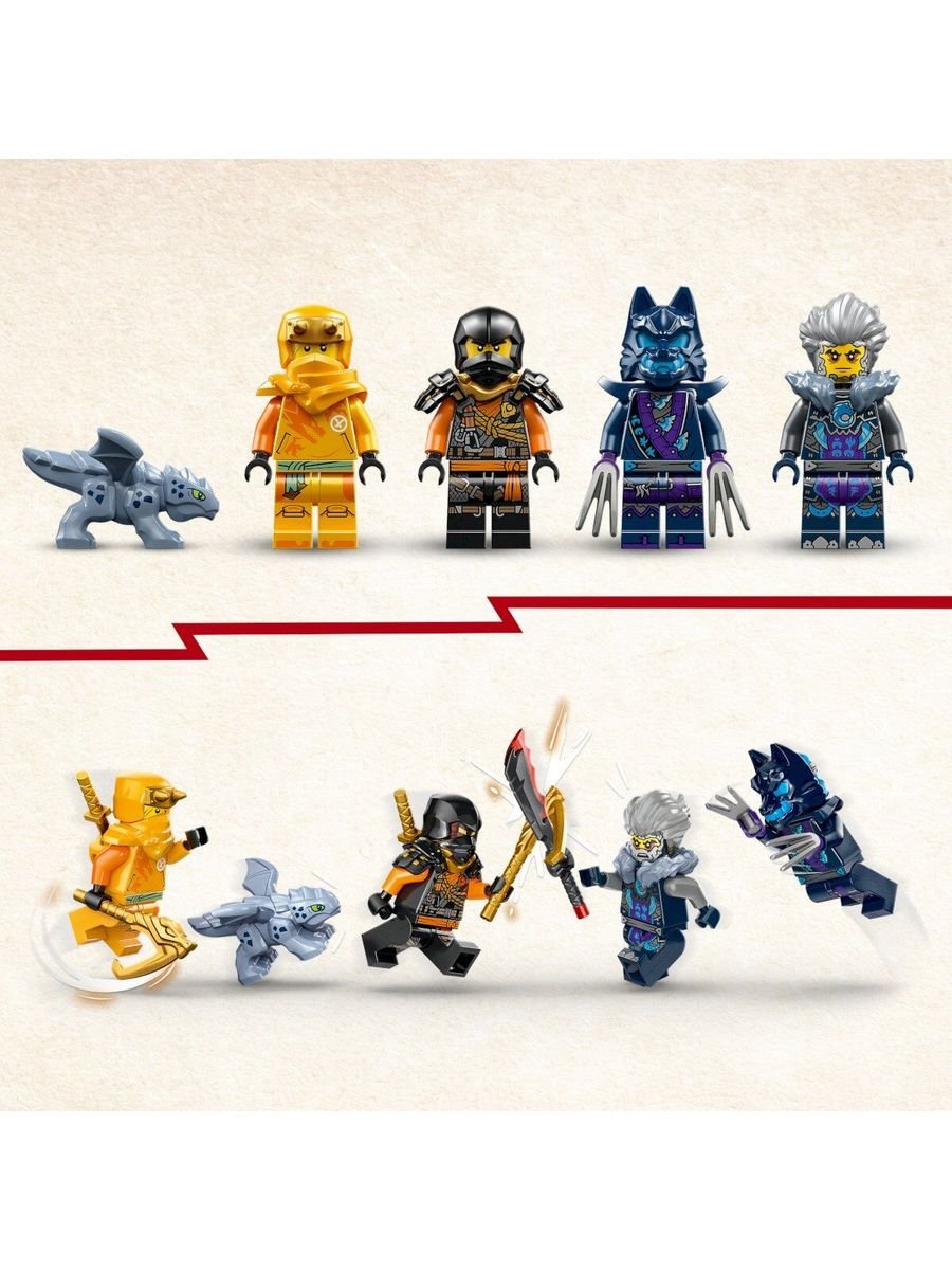 В наборе — сразу 4 минифигурки и очаровательный малыш-дракон Райю. Арин и Скалолаз Коул вооружены крюками и мечами-катана, готовые штурмовать любые препятствия. Им противостоят коварный воин в маске волка с когтями и злодей Синдер с мечом. Дети смогут придумать бесконечные истории о битвах, погонях и спасениях.