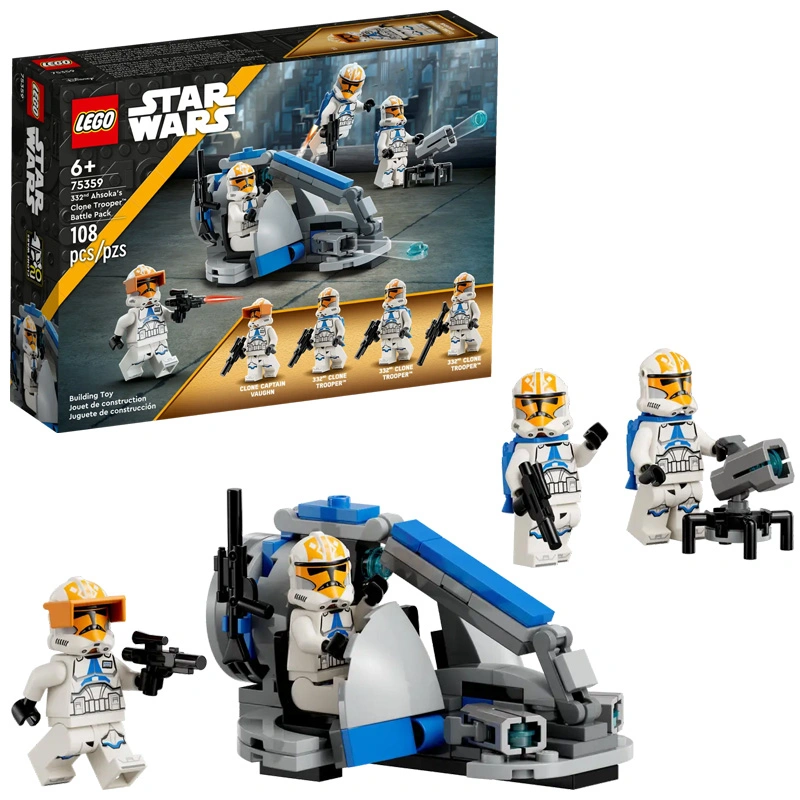Галактика весельяLEGO Group занимается воссозданием космических кораблей, транспортных средств, локаций и персонажей из вселенной “Звездных войн” с 1999 года, и существует огромное разнообразие наборов, которые приведут в восторг поклонников всех возрастов.332–й боевой набор солдат-клонов Асоки (75359) – Дети могут воссоздать сцены “Звездных войн: Войны клонов” и разыграть свои собственные истории с помощью этого детализированного игрового набора LEGO из кирпичиков4 минифигурки LEGO Star Wars – Капитан-клон Вон со специальным шлемом и 3 солдатами-клонами 332-го полка, а также бластерная винтовка, 3 бластера и 2 дополнительных элемента реактивного ранцаСозданы для экшн-игр. – В набор входит спидер поддержки пехоты-клона, оснащенный сиденьями для 2 минифигурок LEGO, обоймами для их бластеров, 2 стрелками–гвоздиками и лазерной пушкой, стреляющей гвоздикамиИдея подарка для детей в возрасте от 6 лет и старше – подарите эту строительную игрушку из 108 деталей в качестве рождественского подарка, подарок на день рождения или особое угощение фанатам “Звездных войн: Войны клонов”Количество деталей: 108 шт.Размер упаковки: 191 x 141 x 46