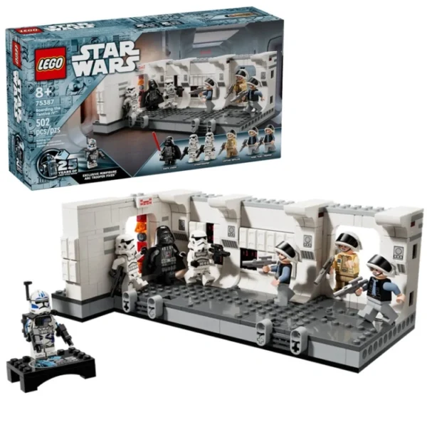 В набор входят целых 7 минифигурок, в том числе специальный клон-солдат Пятерки (CT-5555), посвященный 25-летнему юбилею . В наборе вы получаете Дарта Вейдера, 2 штурмовиков, Рэймуса Антиллеса и 2 повстанцев, что делает этот боевой набор оригинальной трилогии действительно достойным.
