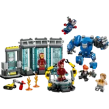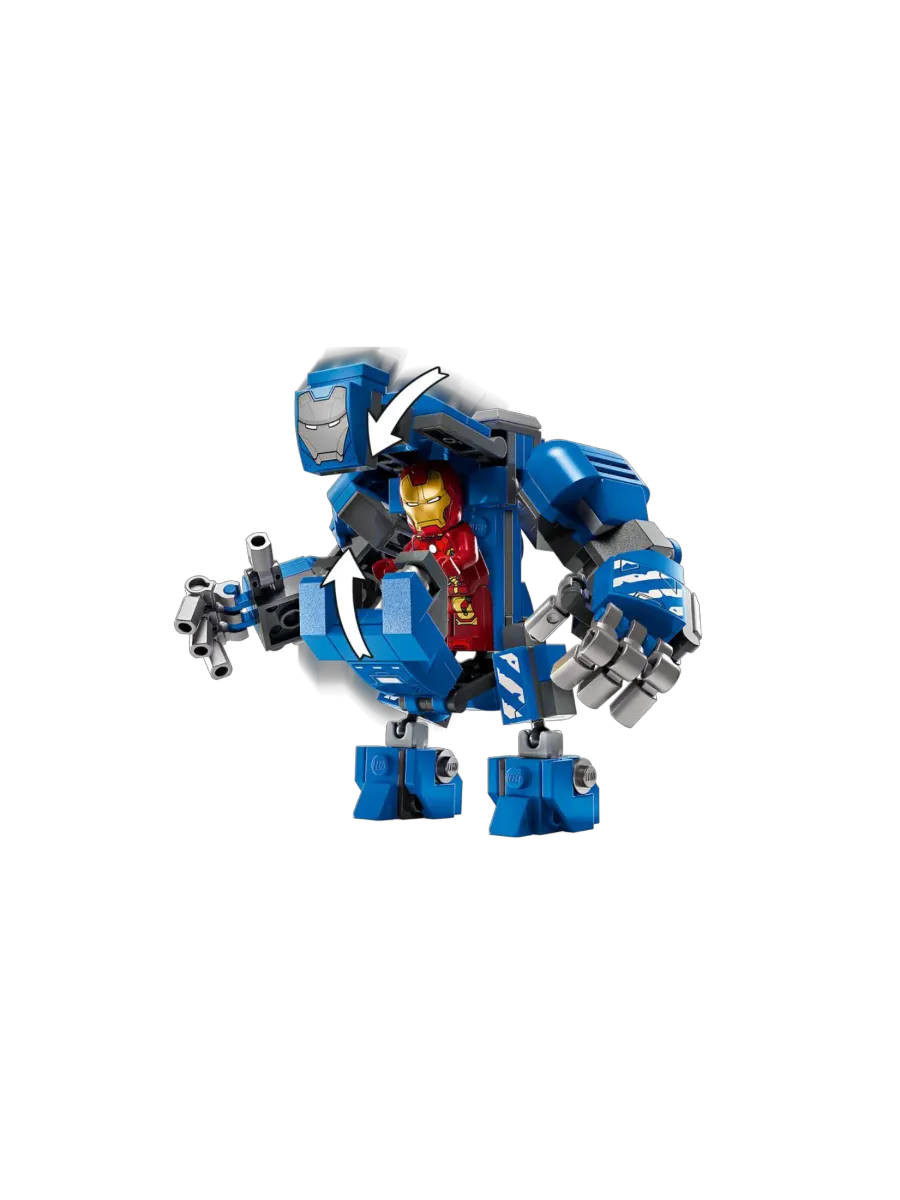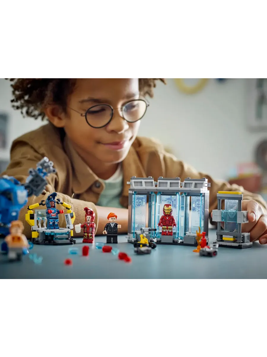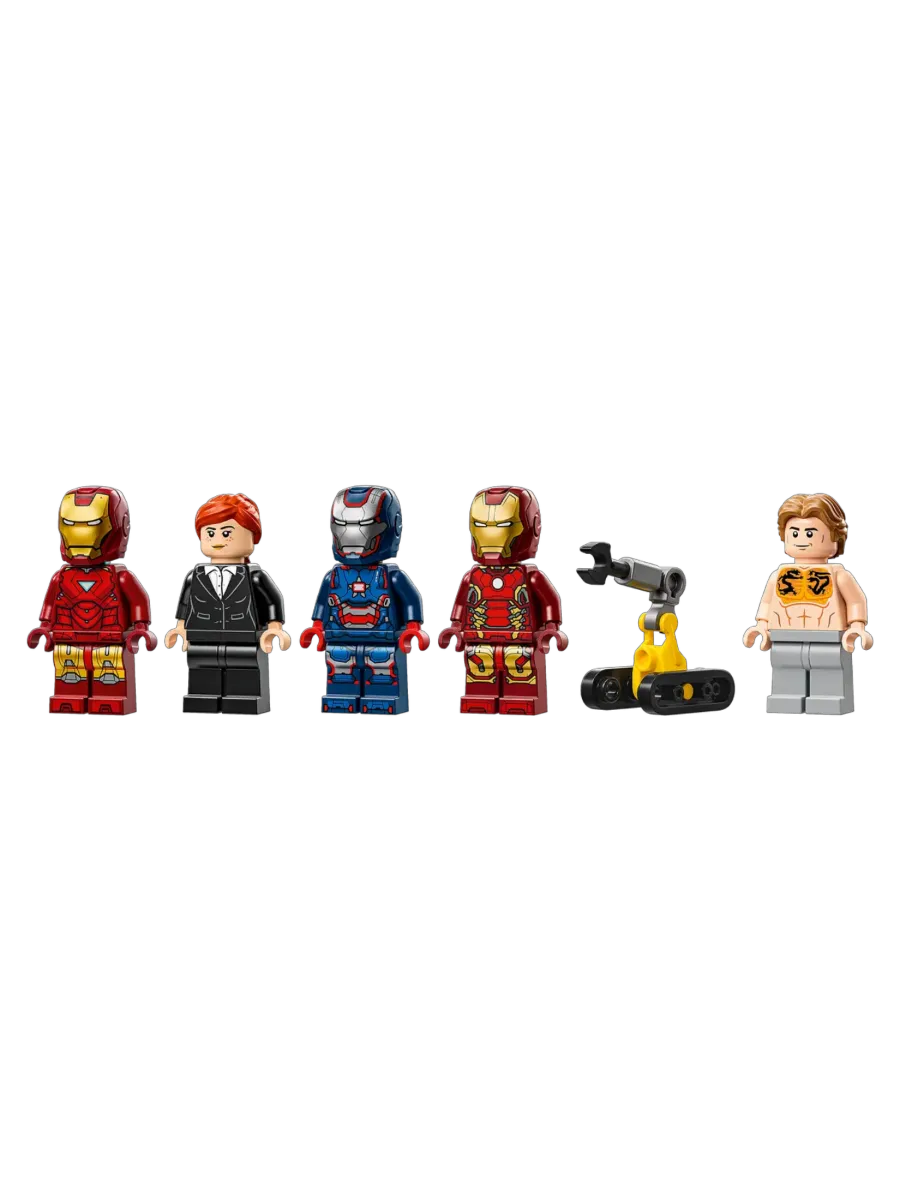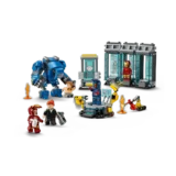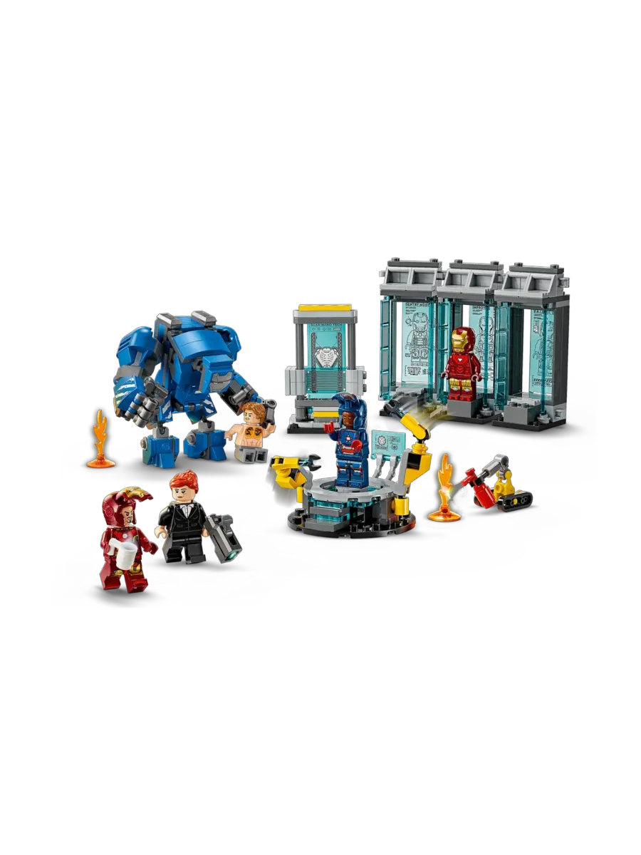 Собери собственный Зал брони с тремя капсулами для доспехов и минифигурками Железного человека в броне MK1, MK43 и MK6. Кроме них, в комплект входят минифигурки Пеппер Поттс и злодея Олдрича Киллиана, а также собираемый помощник-робот Дубина и крупный бронекостюм MK3 с подвижными руками и ногами. В кабину большого робота можно посадить минифигурку, превратив его в грозное орудие в борьбе со злом.