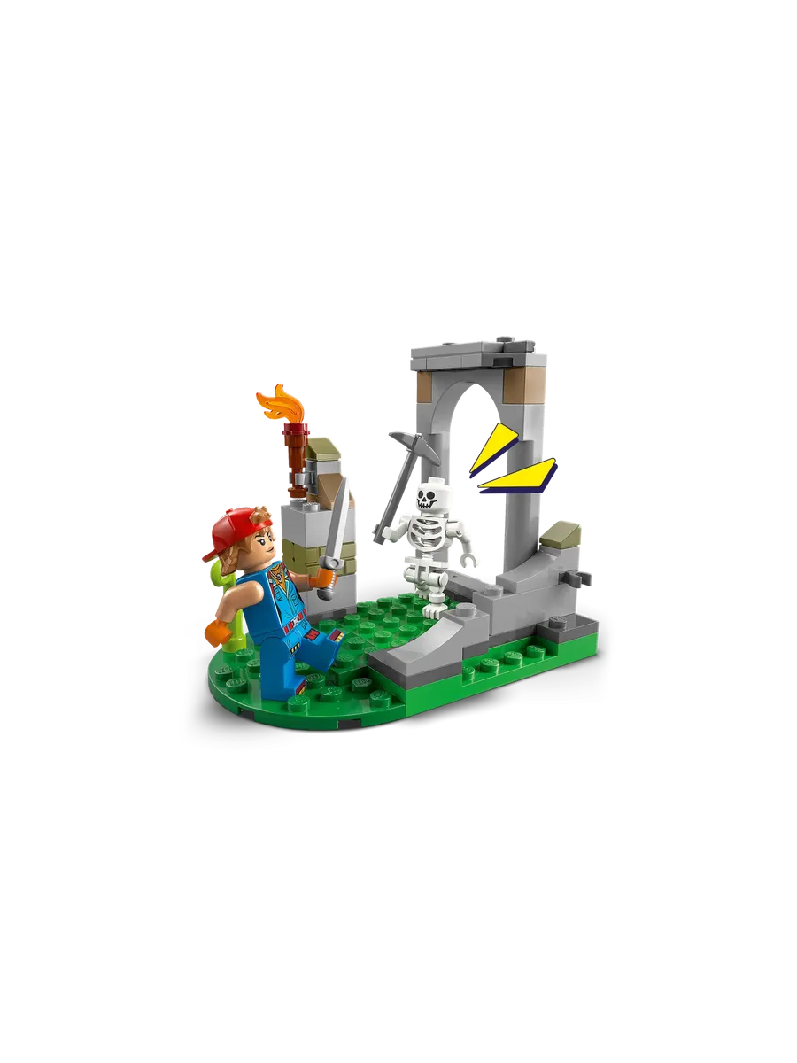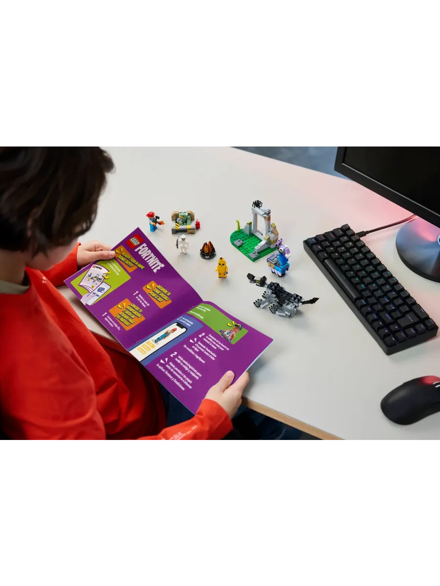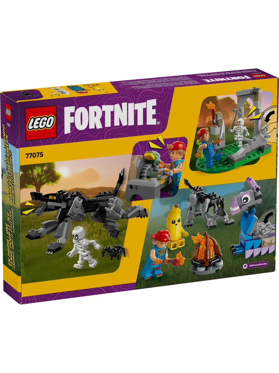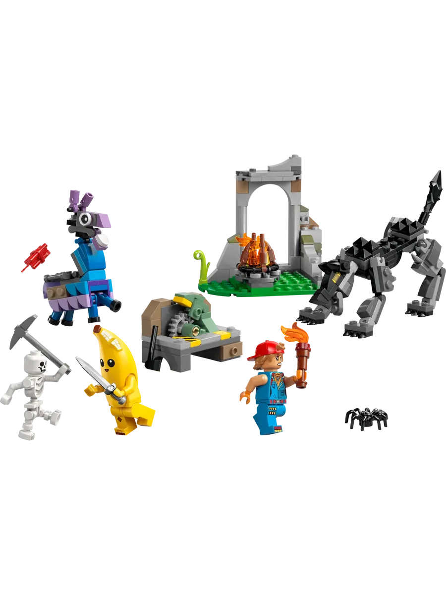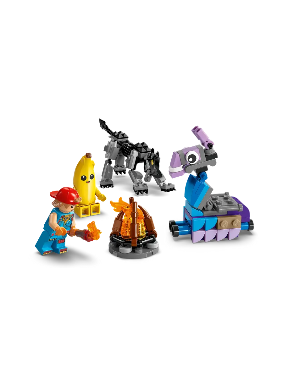 Соберите костер, рабочий верстак и руины, которые можно разрушать и перестраивать — ведь именно такие задачи встречают игроков в начале приключения. В набор входят три минифигурки: легендарный Банан (Peely), находчивая Ремонтница (Sparkplug) и устрашающий скелет. Также здесь есть ламa с припасами и волк с подвижными лапами и хвостом — всё для живой и динамичной ролевой игры.