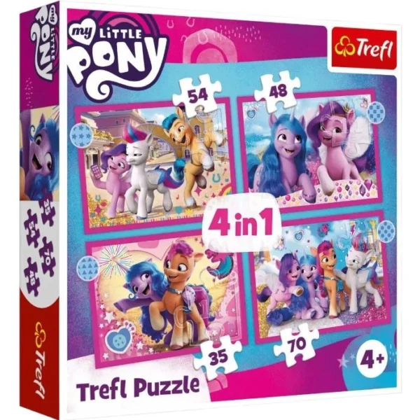 Этот набор — настоящая сказка на столе! Он включает четыре пазла разной сложности: 35, 48, 54 и 70 деталей, каждая сцена — отдельная история в волшебном мире милых пони. Собирая их, ребёнок словно открывает дверь в яркий, красочный мир дружбы, радости и приключений, где каждая деталь оживает под руками.